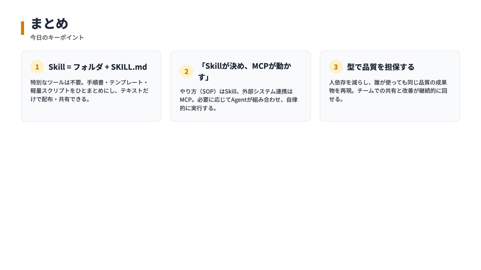 まとめ 今日のキーポイント 1 Skill = フォルダ + SKILL.md 特別なツールは不要。手順書・テンプレート・ 軽量スクリプトをひとまとめにし、テキストだ