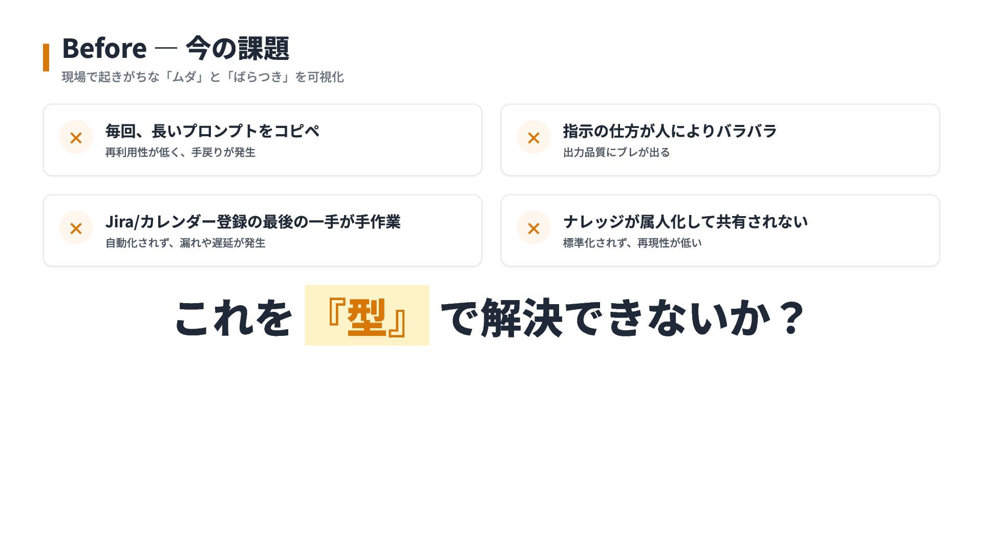 Before — 今の課題 現場で起きがちな「ムダ」と「ばらつき」を可視化 × 毎回、長いプロンプトをコピペ 再利用性が低く、手戻りが発生 × 指示の仕方が人によりバラバラ 出力品質にブレが出る
