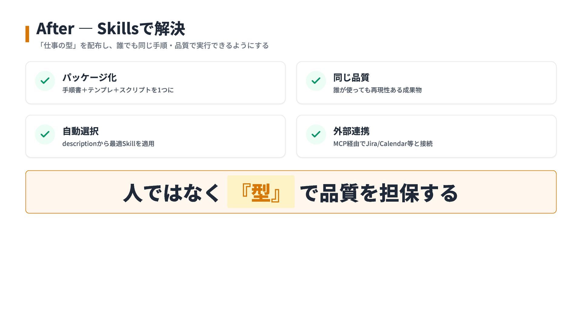 After — Skillsで解決 「仕事の型」を配布し、誰でも同じ手順・品質で実行できるようにする パッケージ化 手順書+テンプレ+スクリプトを1つに 同じ品質 誰が使っても再現性ある成果物 自動選択 descriptionから最適Skillを適用