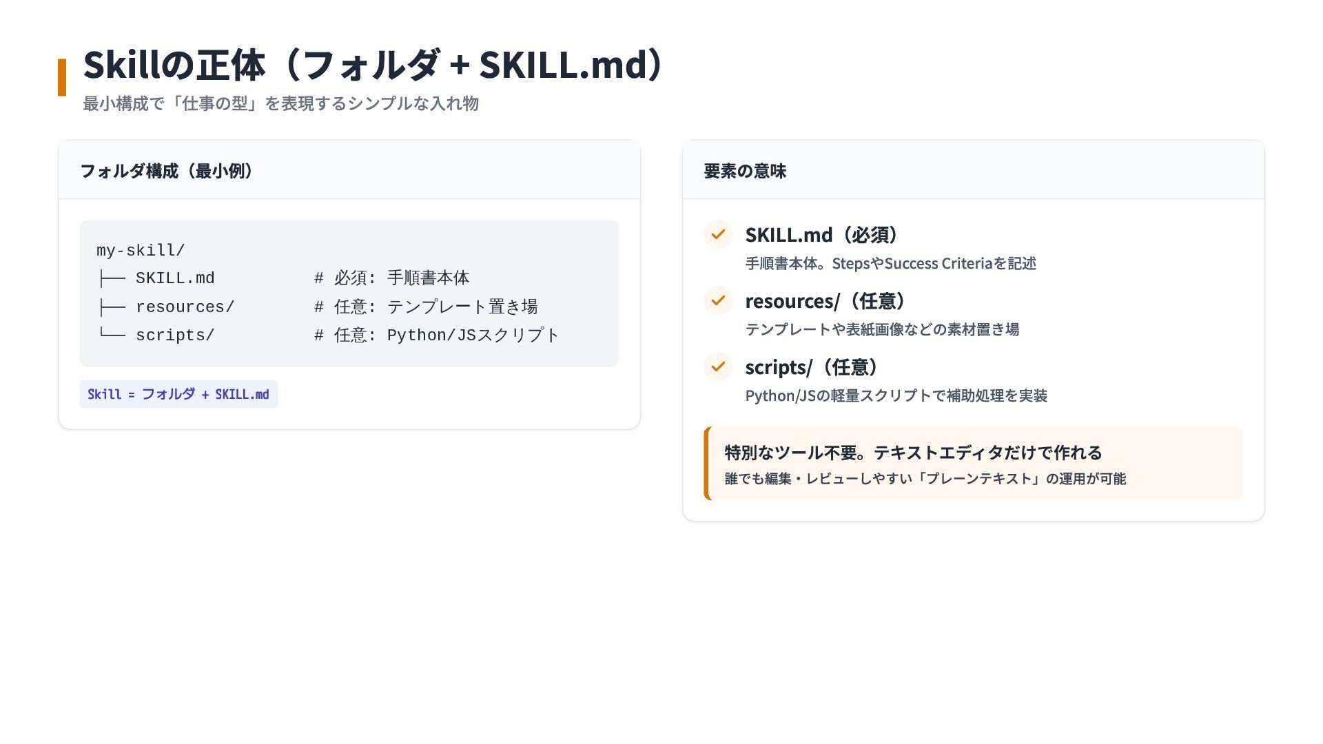 Skillの正体(フォルダ + SKILL.md) 最小構成で「仕事の型」を表現するシンプルな入れ物 フォルダ構成(最小例) my-skill/ ├── SKILL.md # 必須: