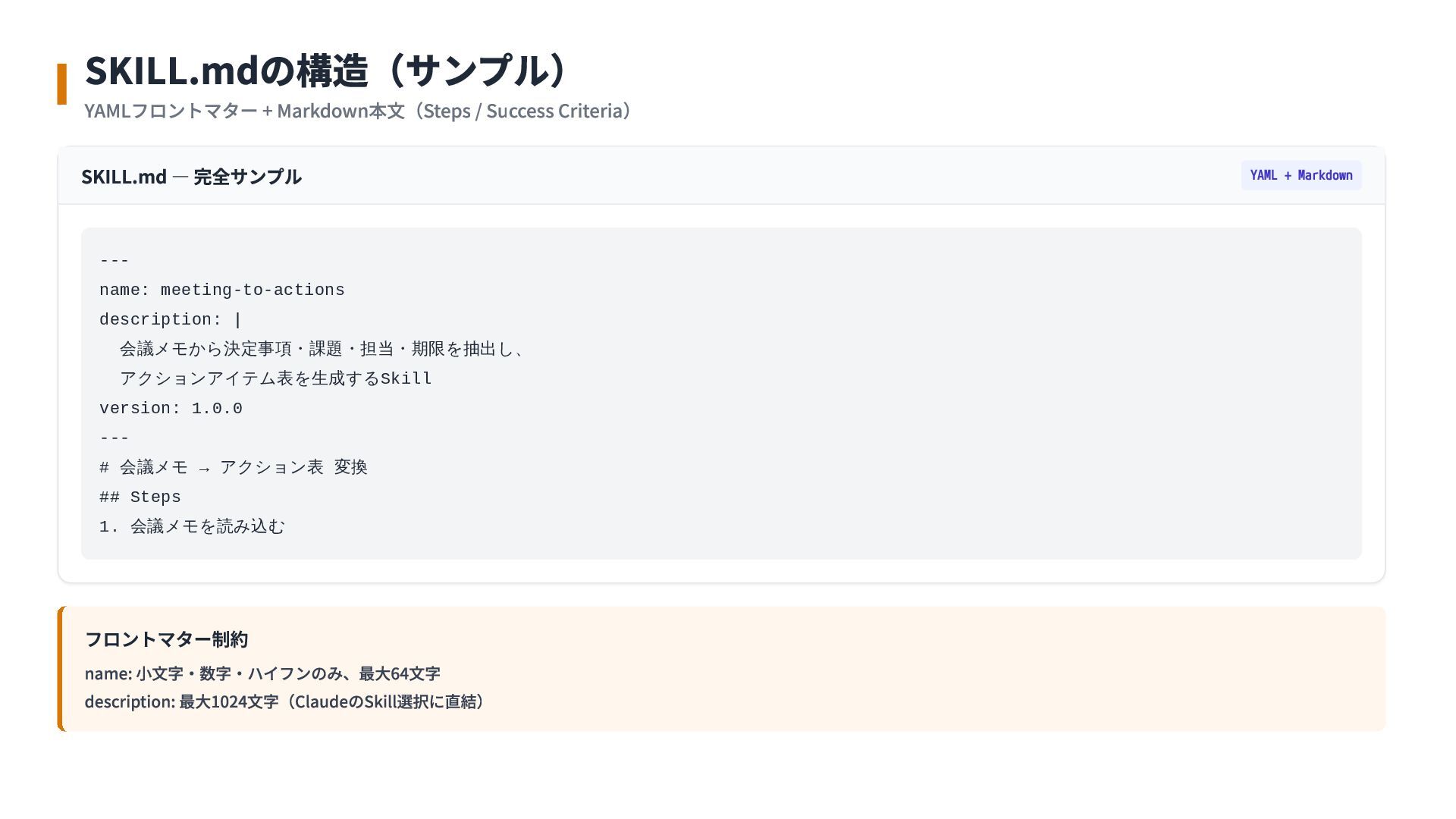 YAML + Markdown --- name: meeting-to-actions description: | 会議メモから決定事項・課題・担当・期限を抽出し、 アクションアイテム表を生成するSkill version: 1.0.0 --- # 会議メモ → アクション表 変換 ## Steps 1. 会議メモを読み込む フロントマター制約 name: 小文字・数字・ハイフンのみ、最大64文字 description: 最大1024文字(ClaudeのSkill選択に直結)