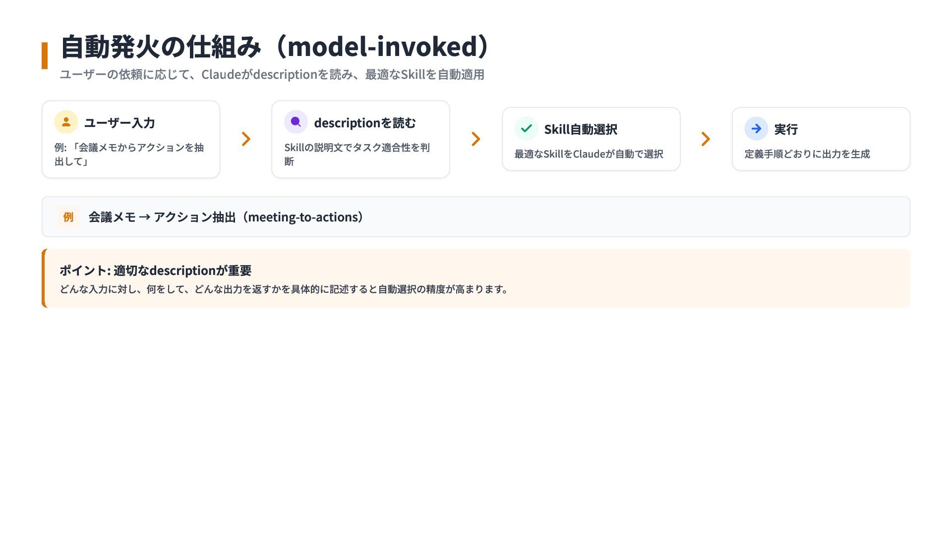 自動発火の仕組み(model-invoked) ユーザーの依頼に応じて、Claudeがdescriptionを読み、最適なSkillを自動適用 ユーザー入力 例: 「会議メモからアクションを抽 出して」 descriptionを読む Skillの説明文でタスク適合性を判 断 Skill自動選択