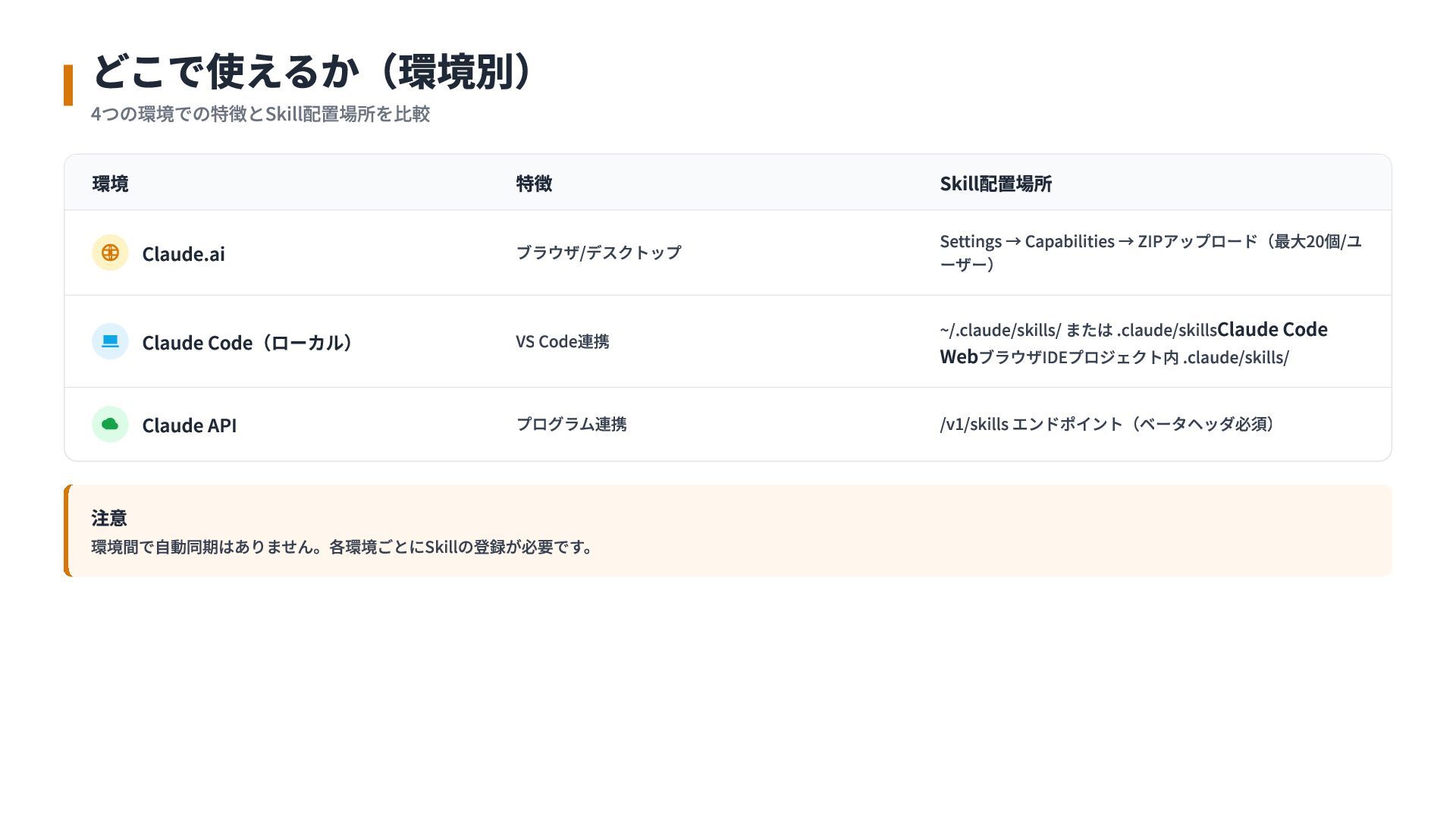 → ZIPアップロード(最大20個/ユ ーザー) Claude Code(ローカル) VS Code連携 ~/.claude/skills/ または .claude/skillsClaude Code WebブラウザIDEプロジェクト内 .claude/skills/ Claude API プログラム連携 /v1/skills エンドポイント(ベータヘッダ必須) 注意 環境間で自動同期はありません。各環境ごとにSkillの登録が必要です。