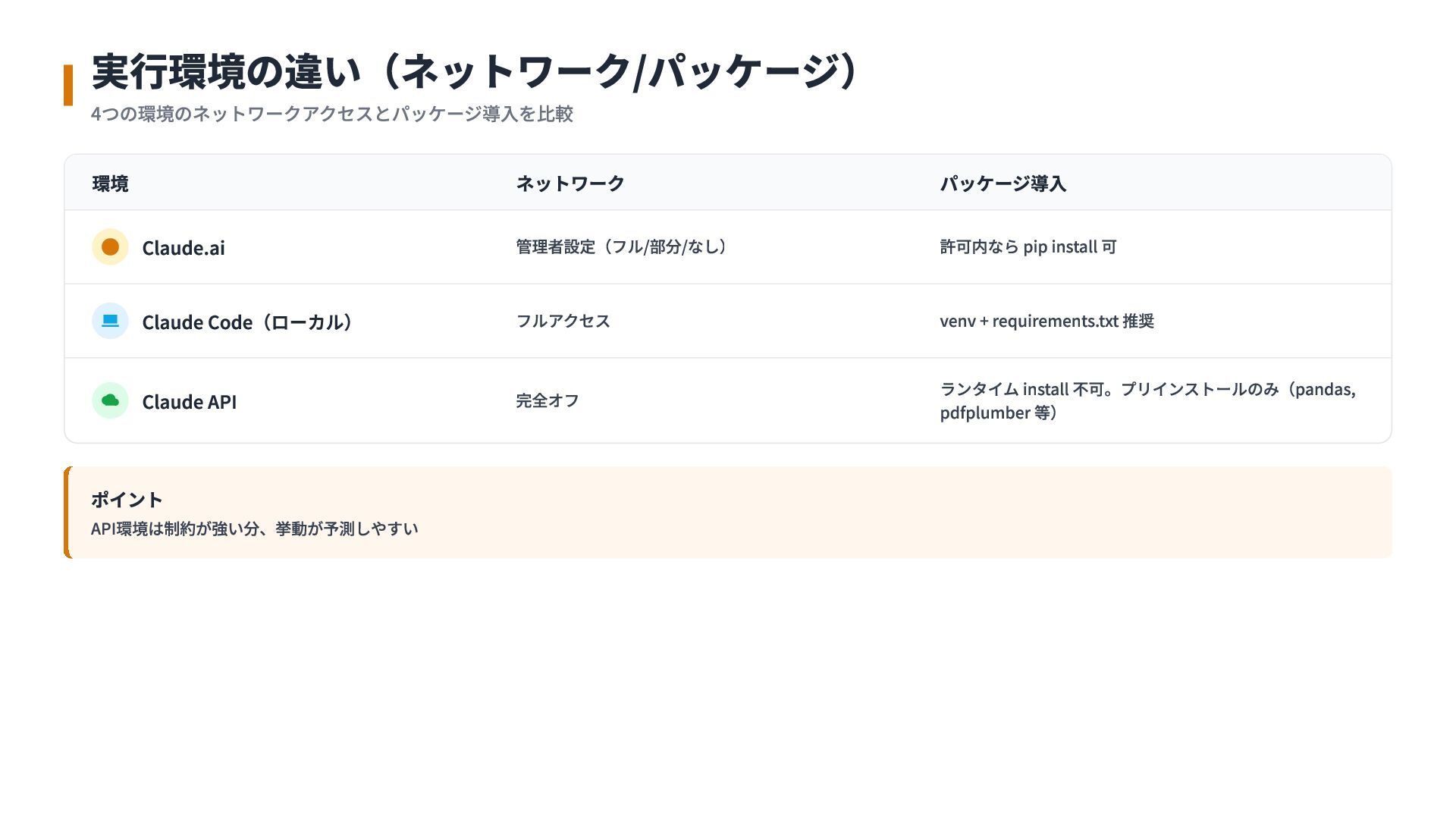 可 Claude Code(ローカル) フルアクセス venv + requirements.txt 推奨 Claude API 完全オフ ランタイム install 不可。プリインストールのみ(pandas, pdfplumber 等) ポイント API環境は制約が強い分、挙動が予測しやすい