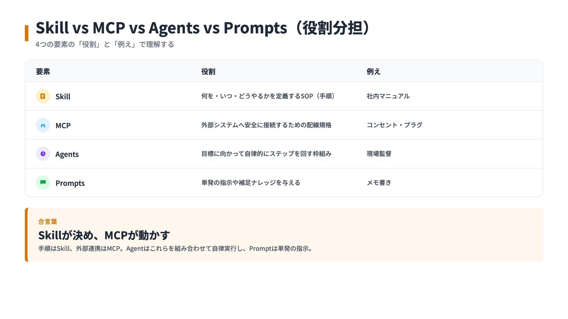 例え Skill 何を・いつ・どうやるかを定義するSOP(手順) 社内マニュアル MCP 外部システムへ安全に接続するための配線規格 コンセント・プラグ Agents 目標に向かって自律的にステップを回す枠組み 現場監督 Prompts 単発の指示や補足ナレッジを与える メモ書き 合言葉 Skillが決め、MCPが動かす 手順はSkill、外部連携はMCP。Agentはこれらを組み合わせて自律実行し、Promptは単発の指示。
