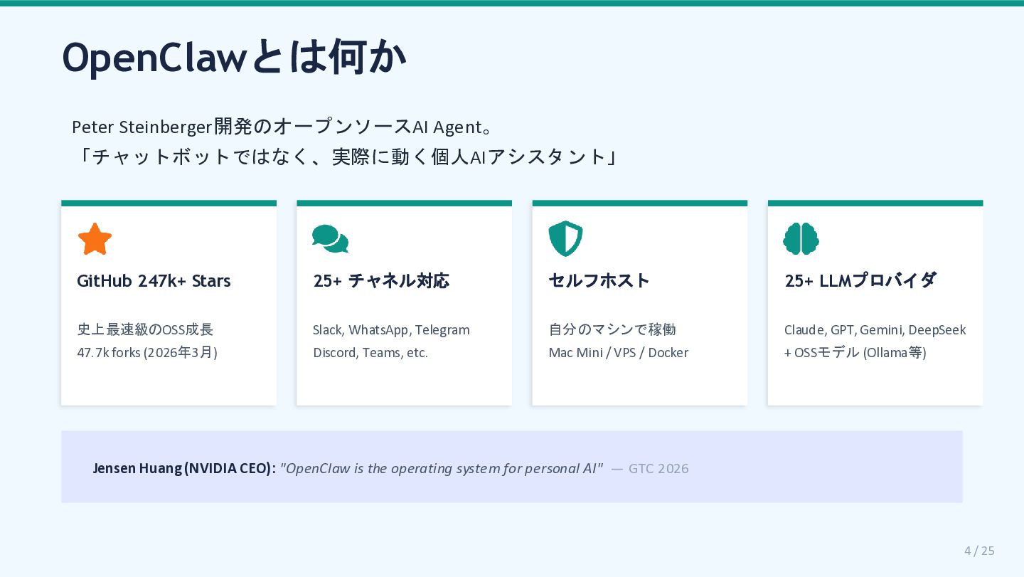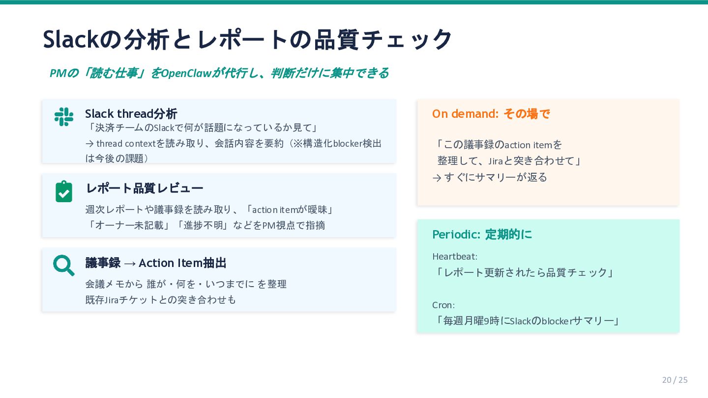 routing Keychain 長期secret(GitHub App key等) Token Broker 短命tokenを生成・配布 Slack Web API bot tokenはhost側のみ 短命 token Docker Sandbox(Agent tool実行) Workspace scripts scripts/gh, scripts/gws, scripts/slack-send CLI tools gh, gws, uv, jq, git, curl, python3 Deterministic detectors scripts/pm-health 等 Registry / Runbook project YAML, identity map 長期secretは一度もcontainer内に入らない 漏れても被害は短命tokenの有効期間のみ Appendix A