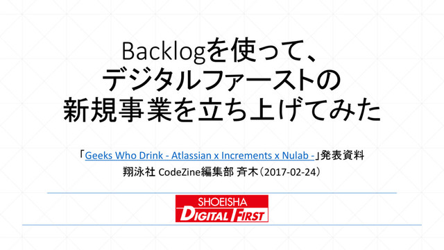 「Geeks Who Drink - Atlassian x Increments x Nulab -」(2017-02-24)における、Backlog事例としての発表内容です。 https://nulab.connpass.com/event/49308/