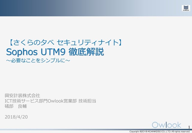 スペック 保護対象 価格(税抜) さくらの クラウド SOPHOS 4コア/16GB 5IP ¥45,468 AWS CheckPoint m4.xlarge (4コア/16GB) 無制限 ¥84,562 Fortinet m3.xlarge (4コア/15GB) ¥170,575 Paloalto m4.xlarge (4コア/16GB) ¥117,380 ※1$:¥106 2018年3月15日現在のレートで計算しております。 ※AWSの料金に関しまして ・ストレージおよびデータ転送は含まれておりません。インスタンスのみの料金となります。 ・単体で起動した際の公表された価格表を参照しております。 参照:https://aws.amazon.com/jp/security/partner-solutions/ 競合他社製品との月額料金比較 1. Sophos UTM9について 9