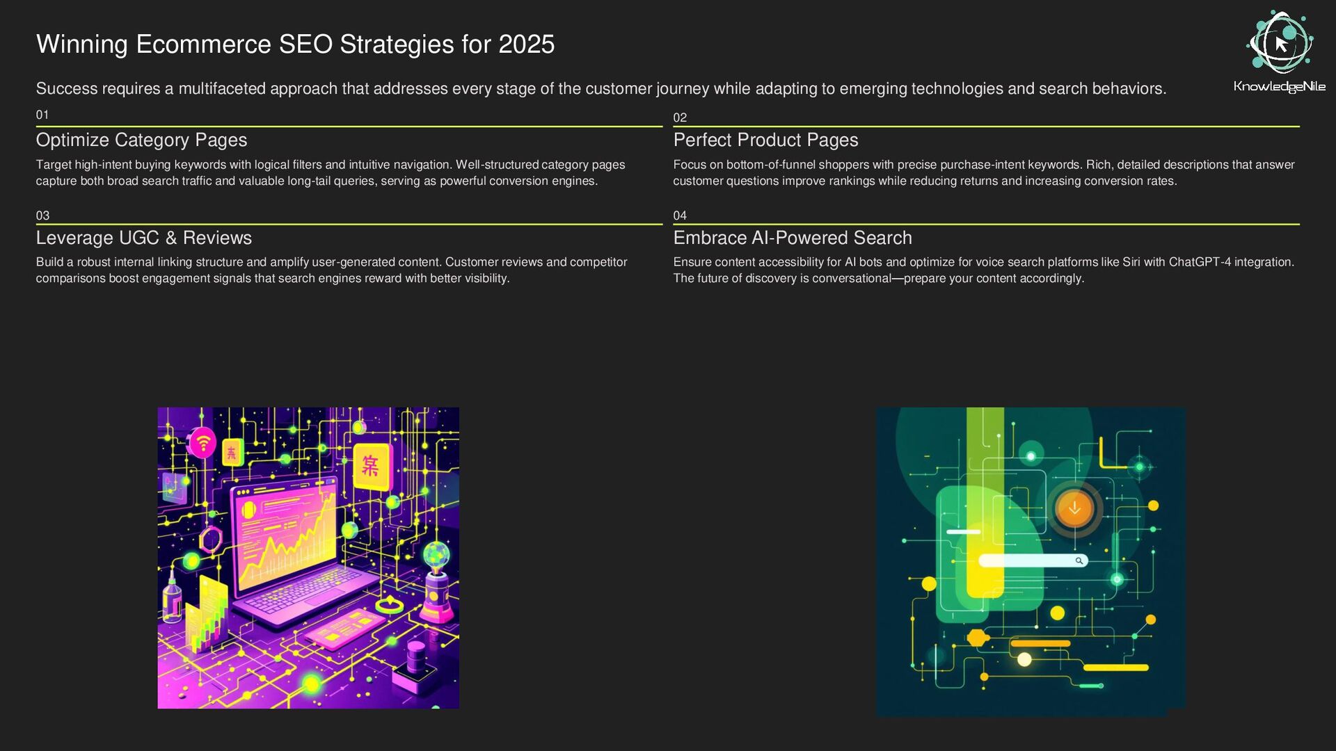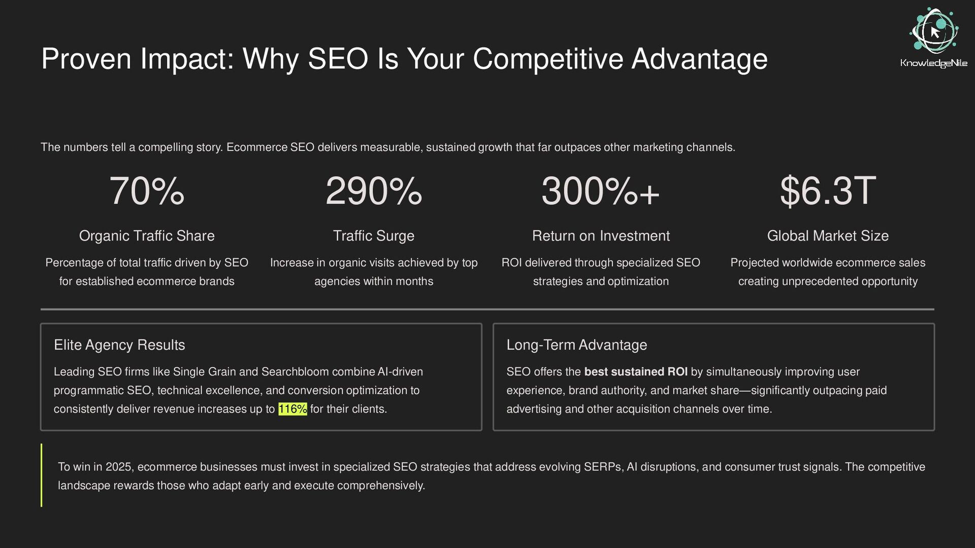 In 2025, competition in eCommerce is fiercer than ever, and visibility is everything. This deck uncovers why SEO remains the most powerful tool for driving sustainable traffic, boosting conversions, and outperforming competitors. Learn the latest search trends, algorithm updates, and proven strategies to elevate your online store’s rankings and dominate the digital marketplace.