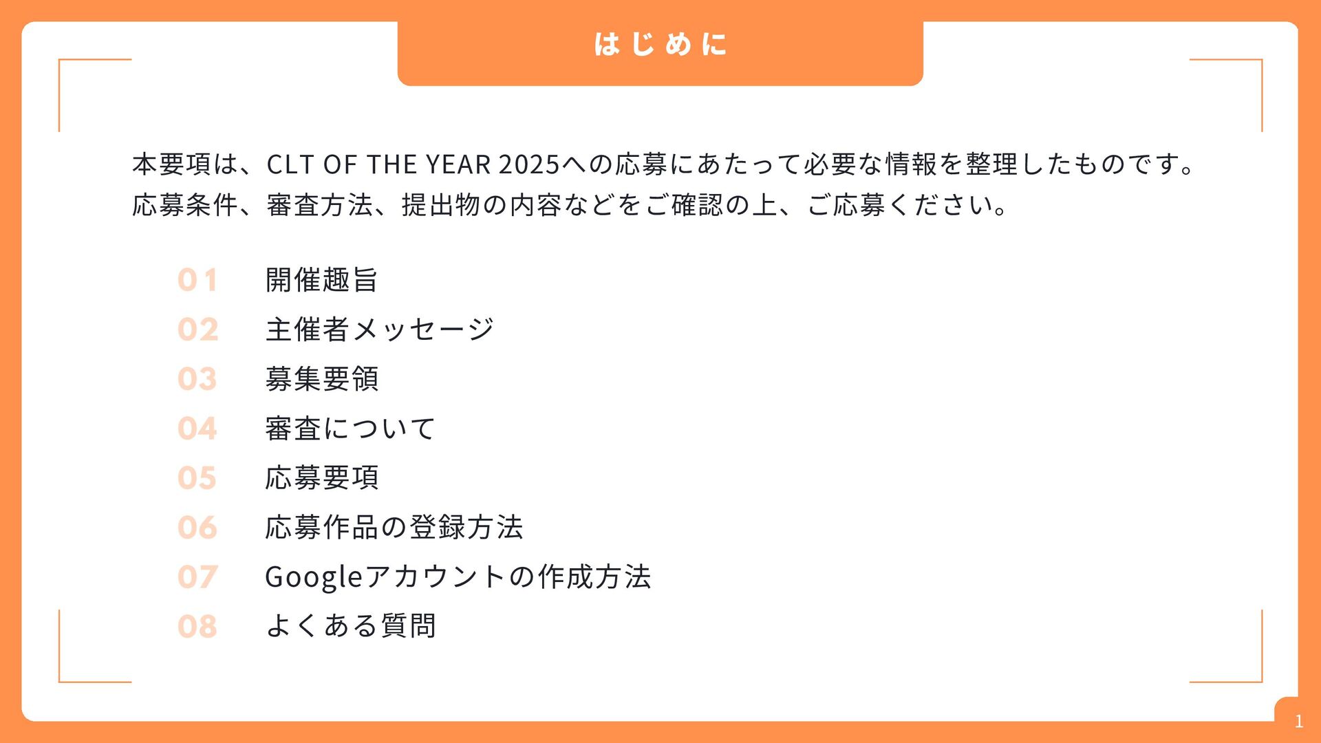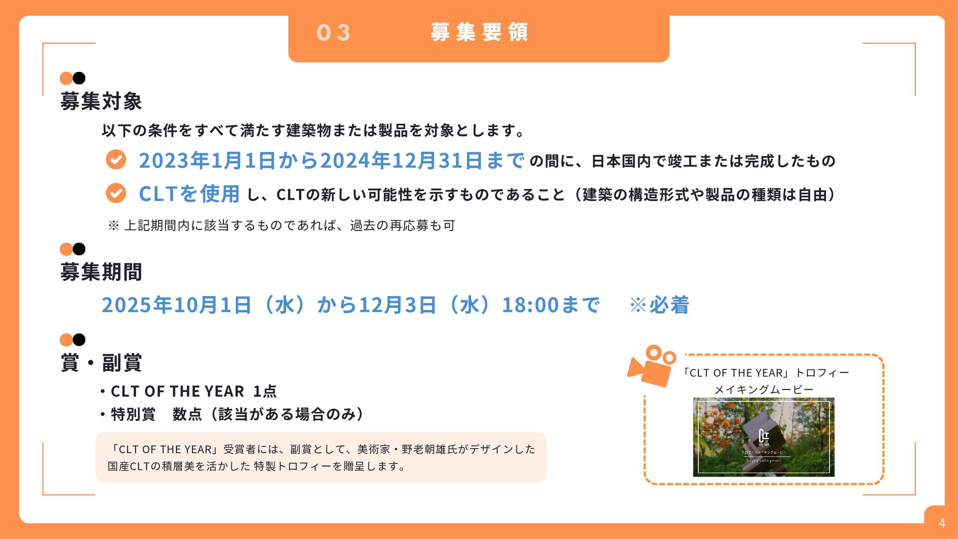 は じ め に 本要項は、CLT OF THE YEAR 2025への応募にあたって必要な情報を整理したものです。 応募条件、審査方法、提出物の内容などをご確認の上、ご応募ください。