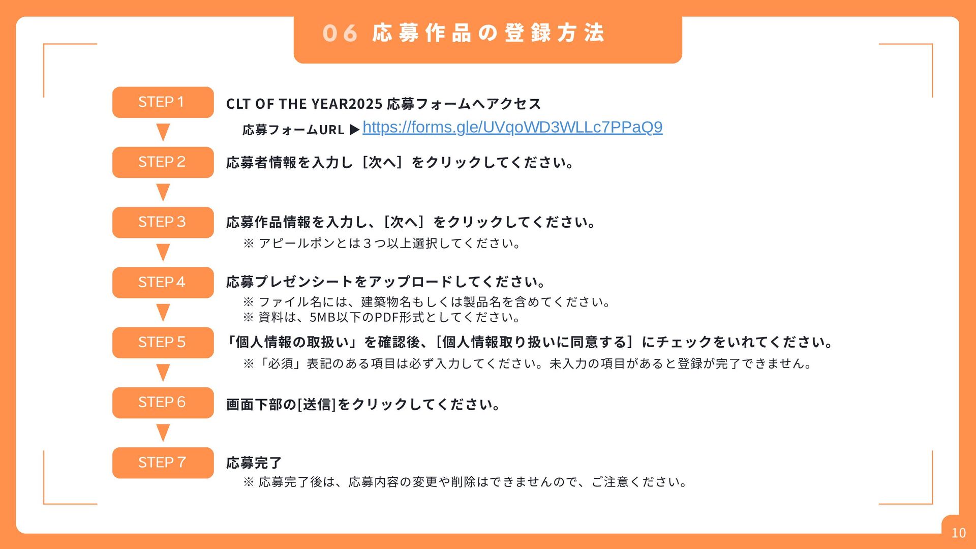 品 の 登 録 方 法 CLT OF THE YEAR2025 応募フォームへアクセス 応募者情報を入力し[次へ]をクリックしてください。 応募作品情報を入力し、 [次へ]をクリックしてください。 ※ アピールポンとは3つ以上選択してください。 応募プレゼンシートをアップロードしてください。 ※ ファイル名には、建築物名もしくは製品名を含めてください。 ※ 資料は、5MB以下のPDF形式としてください。 「個人情報の取扱い」を確認後、 [個人情報取り扱いに同意する]にチェックをいれてください。 ※「必須」表記のある項目は必ず入力してください。未入力の項目があると登録が完了できません。 画面下部の[送信]をクリックしてください。 応募完了 ※ 応募完了後は、応募内容の変更や削除はできませんので、ご注意ください。 応募フォームURL ▶ https://forms.gle/UVqoWD3WLLc7PPaQ9 0 6 10