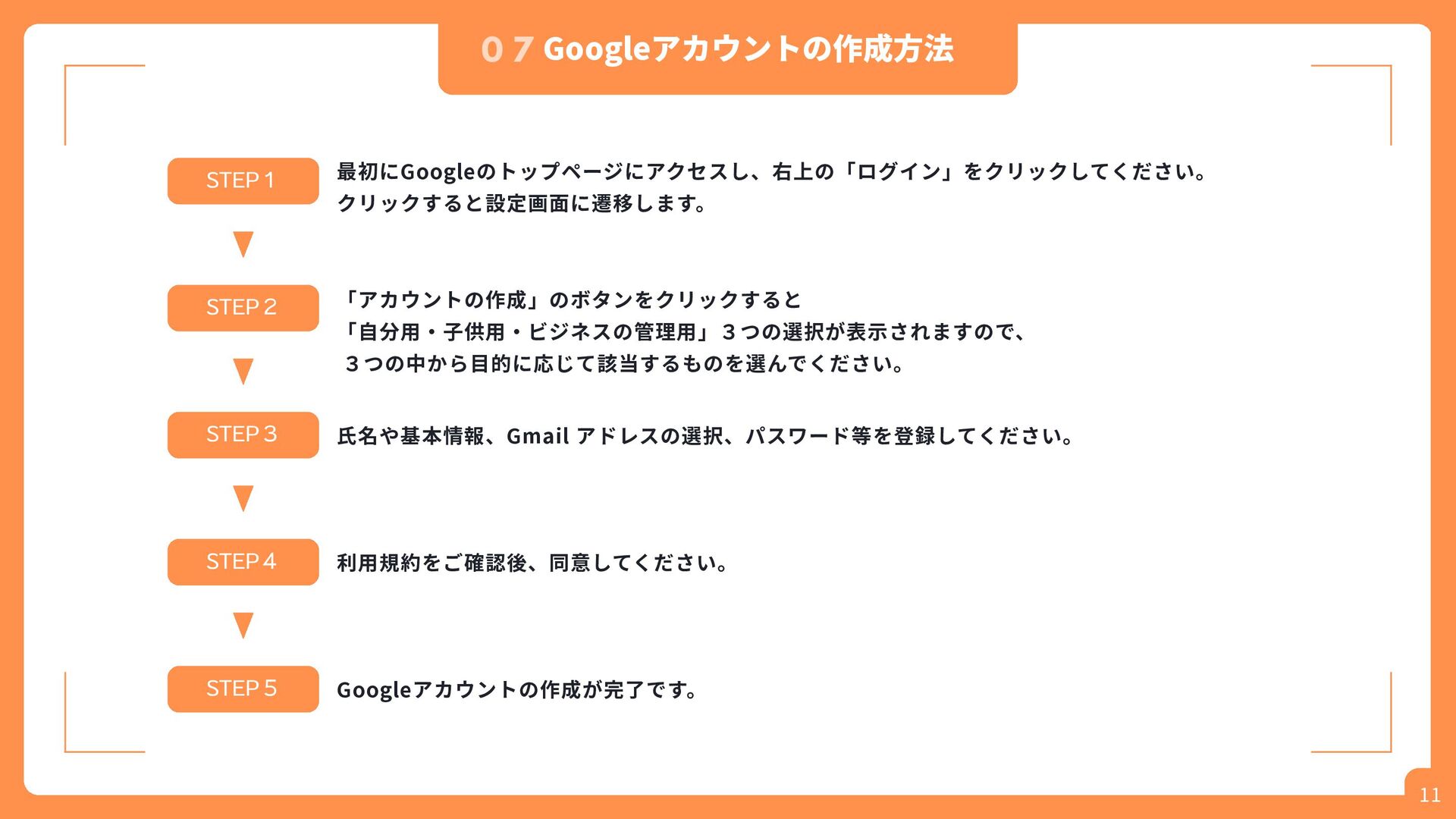 Googleアカウントの作成方法 最初にGoogleのトップページにアクセスし、右上の「ログイン」をクリックしてください。 クリックすると設定画面に遷移します。 「アカウントの作成」のボタンをクリックすると 「自分用・子供用・ビジネスの管理用」3つの選択が表示されますので、 3つの中から目的に応じて該当するものを選んでください。 氏名や基本情報、Gmail アドレスの選択、パスワード等を登録してください。 利用規約をご確認後、同意してください。 Googleアカウントの作成が完了です。