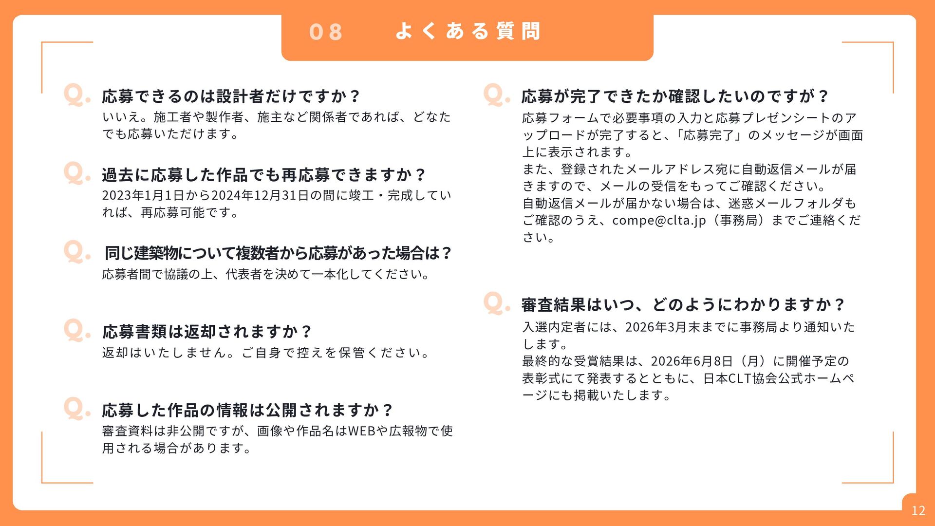 よ く あ る 質 問 入選内定者には、2026年3月末までに事務局より通知いた します。 最終的な受賞結果は、2026年6月8日(月)に開催予定の 表彰式にて発表するとともに、日本CLT協会公式ホームペ