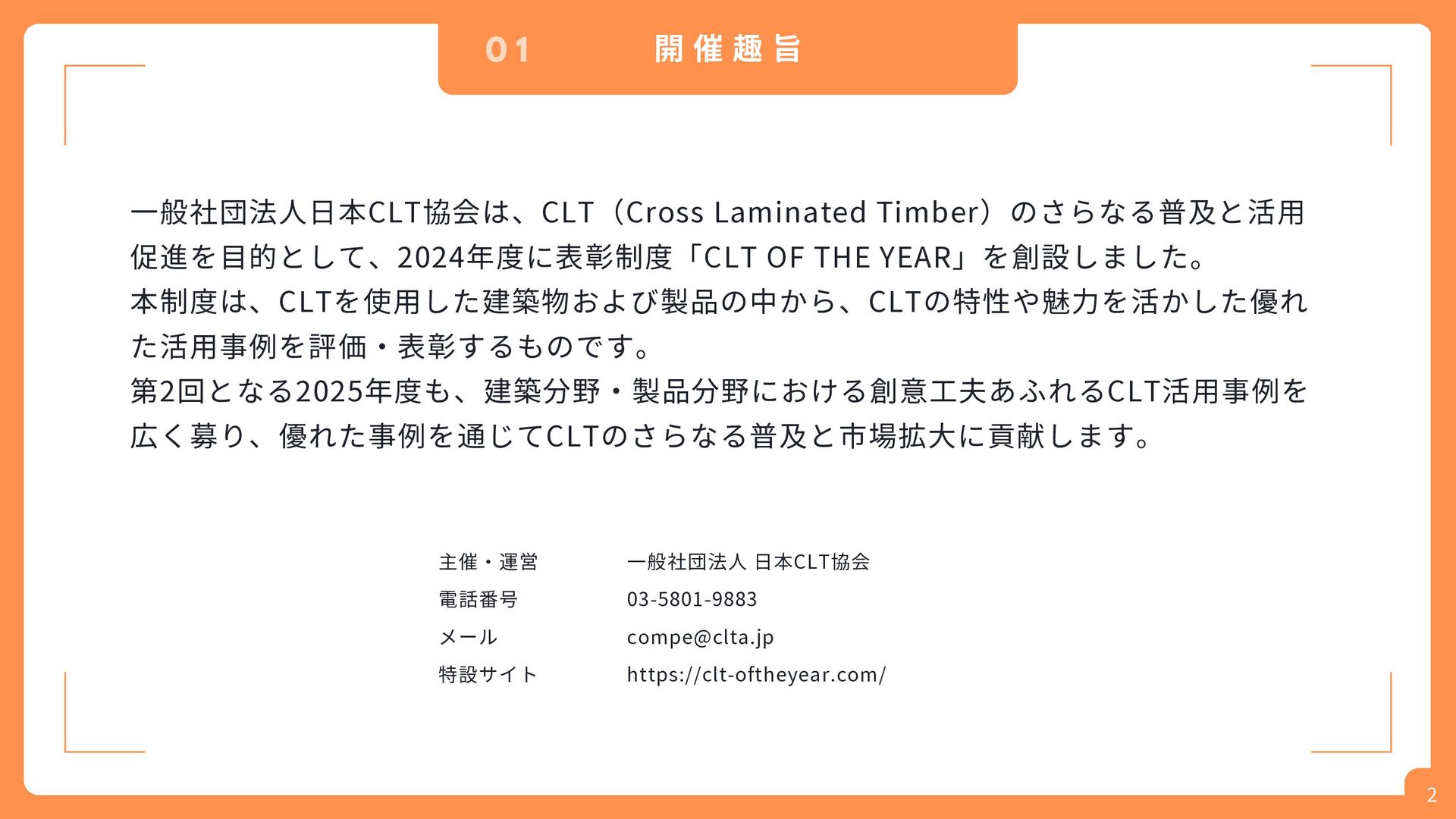 開 催 趣 旨 一般社団法人日本CLT協会は、CLT(Cross Laminated Timber)のさらなる普及と活用 促進を目的として、2024年度に表彰制度「CLT OF THE