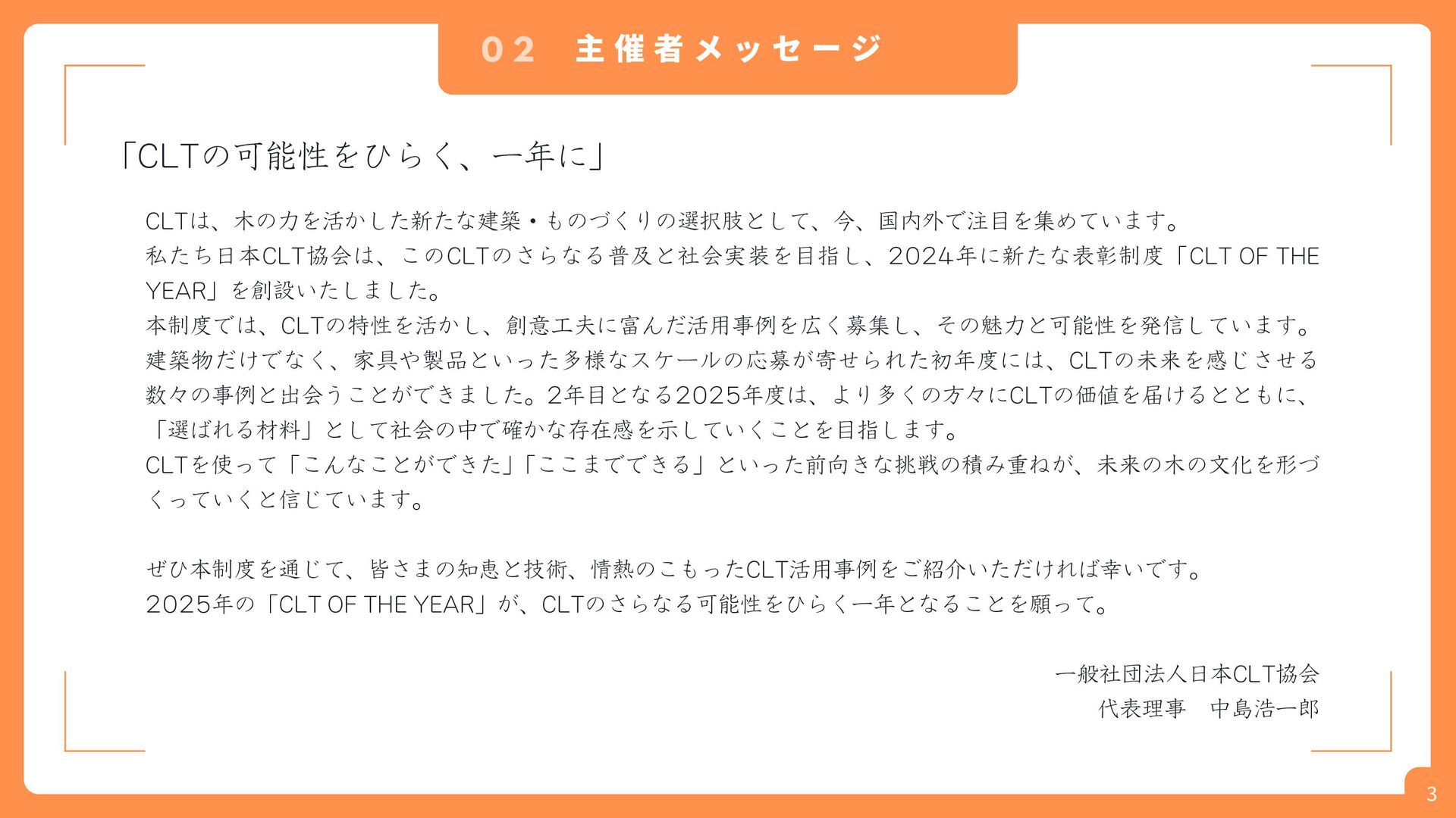 私たち日本CLT協会は、このCLTのさらなる普及と社会実装を目指し、2024年に新たな表彰制度「CLT OF THE YEAR」を創設いたしました。 本制度では、CLTの特性を活かし、創意工夫に富んだ活用事例を広く募集し、その魅力と可能性を発信しています。 建築物だけでなく、家具や製品といった多様なスケールの応募が寄せられた初年度には、CLTの未来を感じさせる 数々の事例と出会うことができました。2年目となる2025年度は、より多くの方々にCLTの価値を届けるとともに、 「選ばれる材料」として社会の中で確かな存在感を示していくことを目指します。 CLTを使って「こんなことができた」 「ここまでできる」といった前向きな挑戦の積み重ねが、未来の木の文化を形づ くっていくと信じています。 ぜひ本制度を通じて、皆さまの知恵と技術、情熱のこもったCLT活用事例をご紹介いただければ幸いです。 2025年の「CLT OF THE YEAR」が、CLTのさらなる可能性をひらく一年となることを願って。 一般社団法人日本CLT協会 代表理事 中島浩一郎 0 2 3