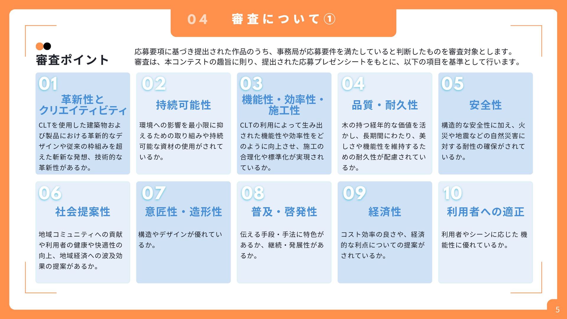 02 持続可能性 04 品質・耐久性 03 機能性・効率性・ 施工性 05 安全性 06 社会提案性 07 意匠性・造形性 08 普及・啓発性 09 経済性 10 利用者への適正 CLTを使用した建築物およ び製品における革新的なデ ザインや従来の枠組みを超 えた斬新な発想、技術的な 革新性があるか。 環境への影響を最小限に抑 えるための取り組みや持続 可能な資材の使用がされて いるか。 CLTの利用によって生み出 された機能性や効率性をど のように向上させ、施工の 合理化や標準化が実現され ているか。 木の持つ経年的な価値を活 かし、長期間にわたり、美 しさや機能性を維持するた めの耐久性が配慮されてい るか。 構造的な安全性に加え、火 災や地震などの自然災害に 対する耐性の確保がされて いるか。 地域コミュニティへの貢献 や利用者の健康や快適性の 向上、地域経済への波及効 果の提案があるか。 構造やデザインが優れてい るか。 伝える手段・手法に特色が あるか、継続・発展性があ るか。 コスト効率の良さや、経済 的な利点についての提案が されているか。 利用者やシーンに応じた 機 能性に優れているか。 応募要項に基づき提出された作品のうち、事務局が応募要件を満たしていると判断したものを審査対象とします。 審査は、本コンテストの趣旨に則り、提出された応募プレゼンシートをもとに、以下の項目を基準として行います。 0 4 審査ポイント 5