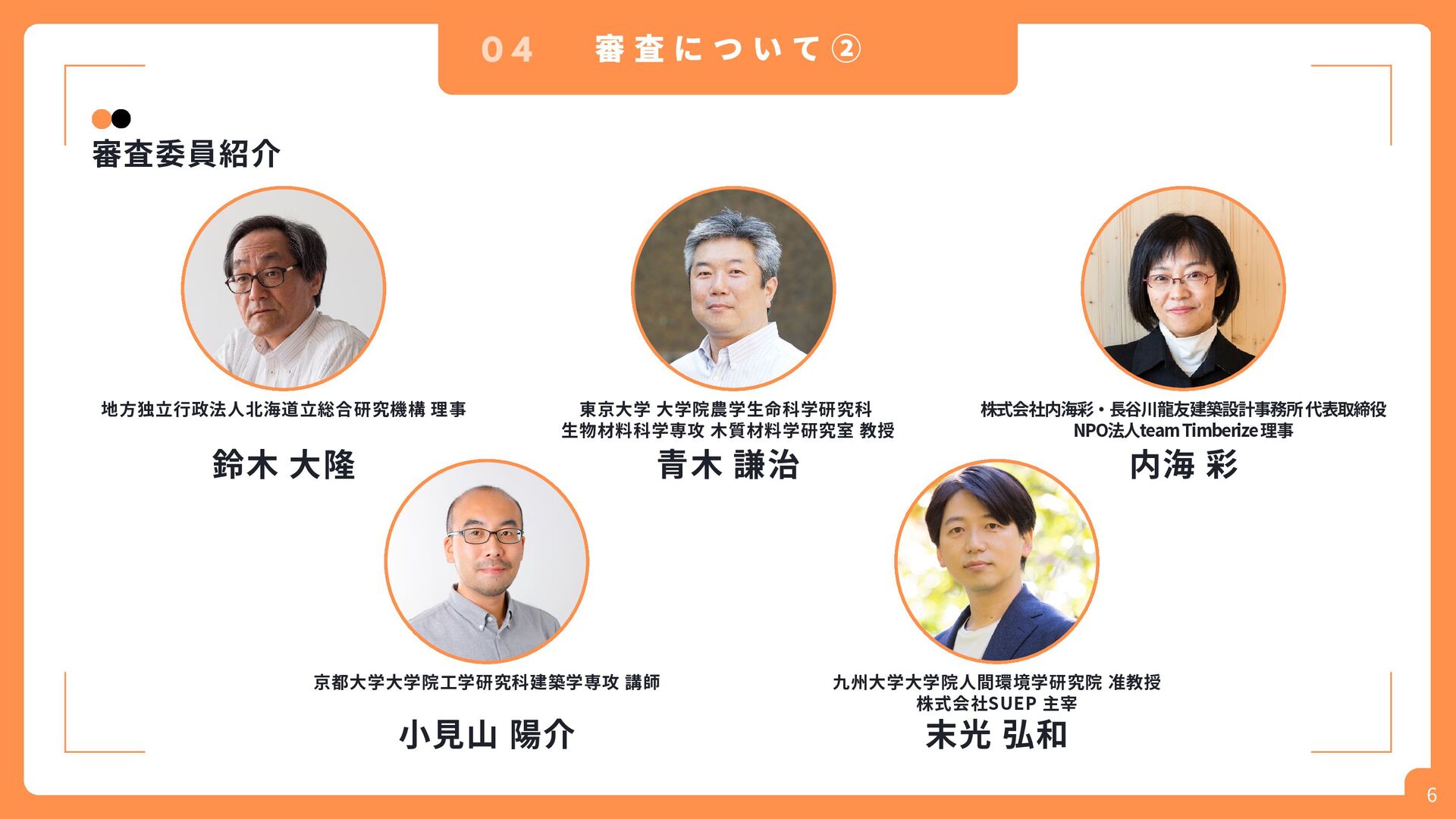 謙治 京都大学大学院工学研究科建築学専攻 講師 小見山 陽介 九州大学大学院人間環境学研究院 准教授 株式会社SUEP 主宰 末光 弘和 株式会社内海彩・長谷川龍友建築設計事務所 代表取締役 NPO法人team Timberize 理事 内海 彩 審査委員紹介 審 査 に つ い て ② 0 4 6