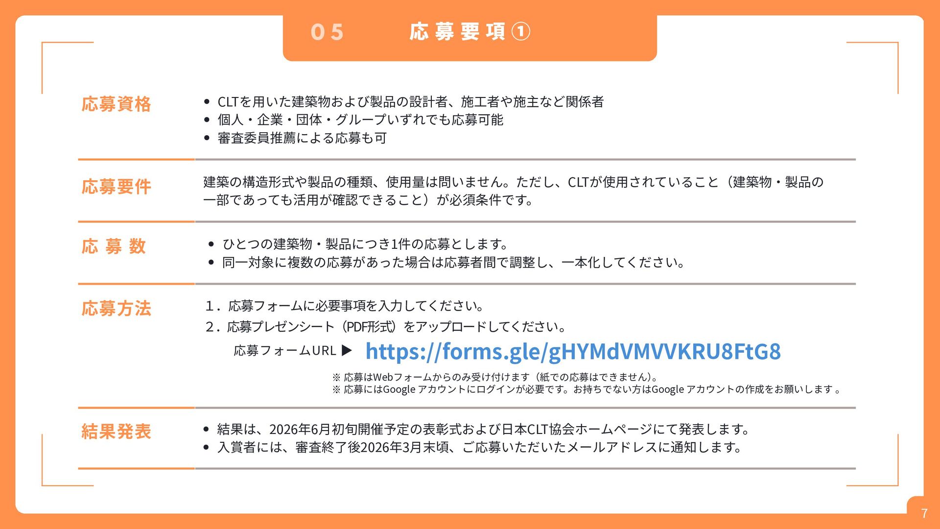 個人・企業・団体・グループいずれでも応募可能 審査委員推薦による応募も可 応 募 数 ひとつの建築物・製品につき1件の応募とします。 同一対象に複数の応募があった場合は応募者間で調整し、一本化してください。 応募方法 2.応募プレゼンシート(PDF形式)をアップロードしてください 。 ※ 応募はWebフォームからのみ受け付けます(紙での応募はできません) 。 ※ 応募にはGoogle アカウントにログインが必要です。お持ちでない方はGoogle アカウントの作成をお願いします 。 1.応募フォームに必要事項を入力してください。 https://forms.gle/gHYMdVMVVKRU8FtG8 応募フォームURL ▶ 結果発表 結果は、2026年6月初旬開催予定の表彰式および日本CLT協会ホームページにて発表します。 入賞者には、審査終了後2026年3月末頃、ご応募いただいたメールアドレスに通知します。 0 5 7