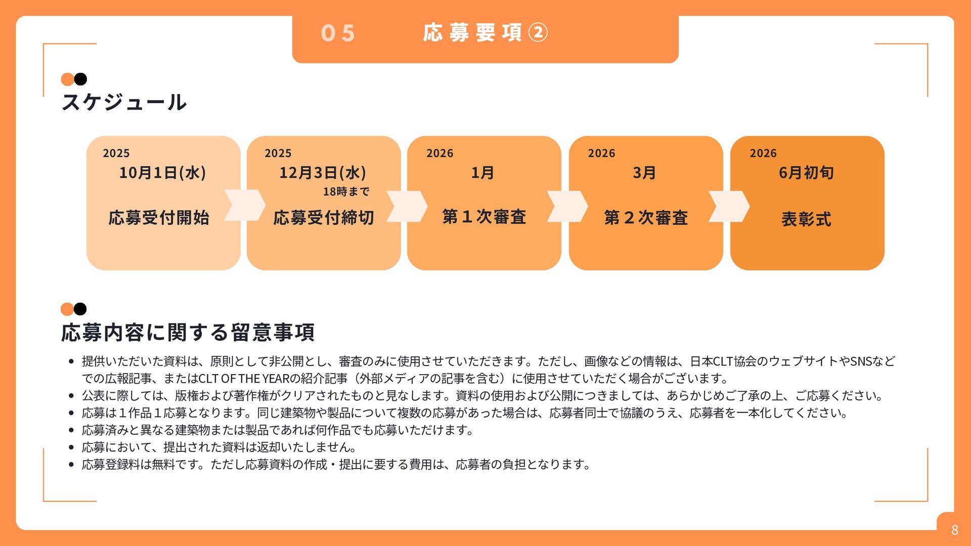 応募内容に関する留意事項 スケジュール 応募受付締切 第1次審査 提供いただいた資料は、原則として非公開とし、審査のみに使用させていただきます。ただし、画像などの情報は、日本CLT協会のウェブサイトやSNSなど での広報記事、またはCLT OF THE YEARの紹介記事(外部メディアの記事を含む)に使用させていただく場合がございます。 公表に際しては、版権および著作権がクリアされたものと見なします。資料の使用および公開につきましては、あらかじめご了承の上、ご応募ください。