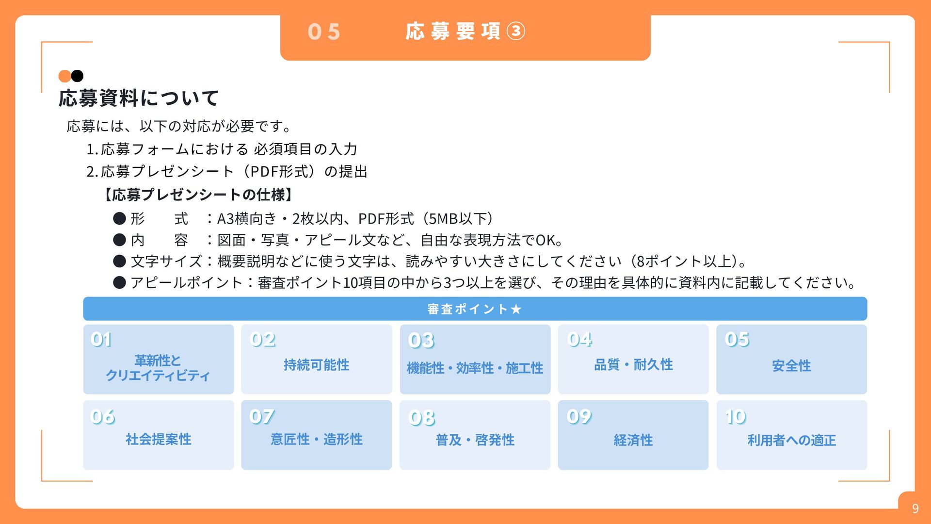 ン ト ★ 01 01 01 革新性と クリエイティビティ 02 02 02 持続可能性 04 04 04 品質・耐久性 03 03 03 機能性・効率性・施工性 05 05 05 安全性 社会提案性 意匠性・造形性 普及・啓発性 経済性 06 06 06 07 07 07 08 08 08 09 09 09 10 10 10 利用者への適正 • 形 式 :A3横向き・2枚以内、PDF形式(5MB以下) • 内 容 :図面・写真・アピール文など、自由な表現方法でOK。 • 文字サイズ:概要説明などに使う文字は、読みやすい大きさにしてください(8ポイント以上) 。 • アピールポイント:審査ポイント10項目の中から3つ以上を選び、その理由を具体的に資料内に記載してください。 応募資料について 0 5 9 【応募プレゼンシートの仕様】 1.応募フォームにおける 必須項目の入力 2.応募プレゼンシート(PDF形式)の提出