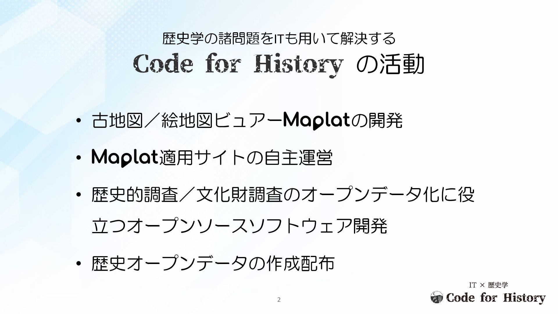 • 古地図/絵地図ビュアーMの開発 • M適用サイトの自主運営 • 歴史的調査/文化財調査のオープンデータ化に役 立つオープンソースソフトウェア開発 • 歴史オープンデータの作成配布 Code