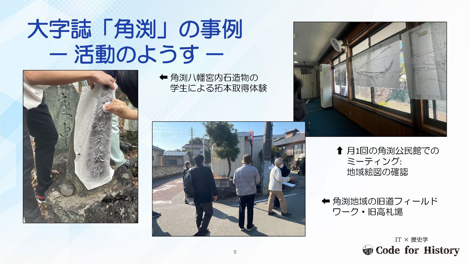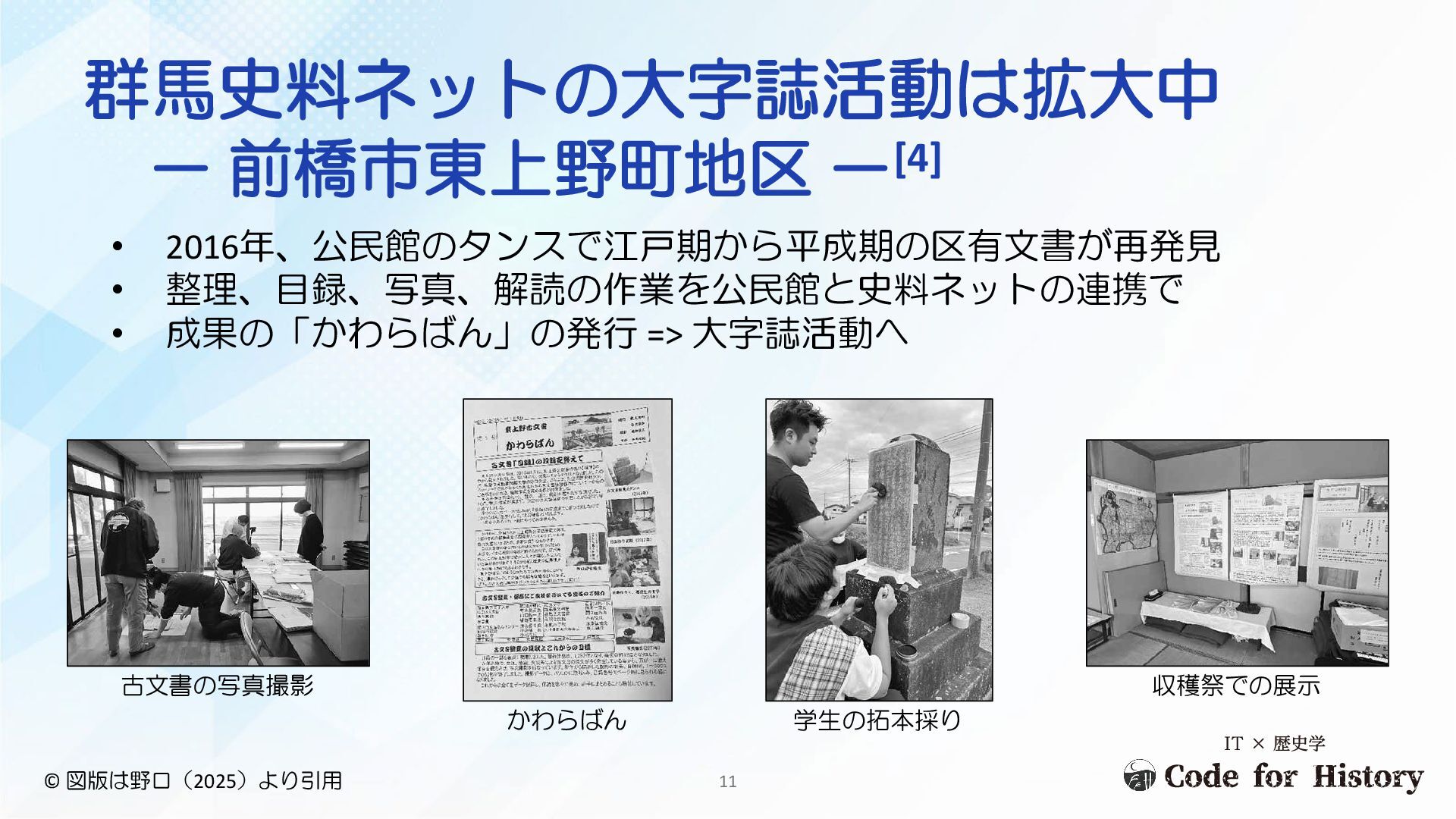 => 大字誌活動へ 古文書の写真撮影 かわらばん 学生の拓本採り 収穫祭での展示 © 図版は野口(2025)より引用 11