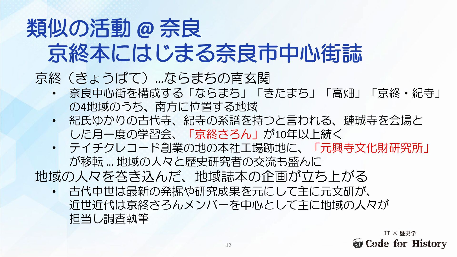元興寺文化財研究所では 成果を元にした特別展も 開催 ➡ 同様のスキームでの 「ならまち本」作成も、 「奈良町座」グループを 中心に進行中 きたまち、高畑の各地区 にも、現地団体に活動が 紹介され、検討に入った