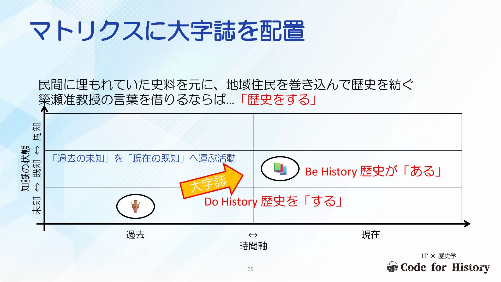 民間に埋もれていた史料を元に、地域住民を巻き込んで歴史を紡ぐ マトリクスに大字誌を配置 知識の状態 未知 ⇔ 既知 ⇔ 周知 過去 ⇔
