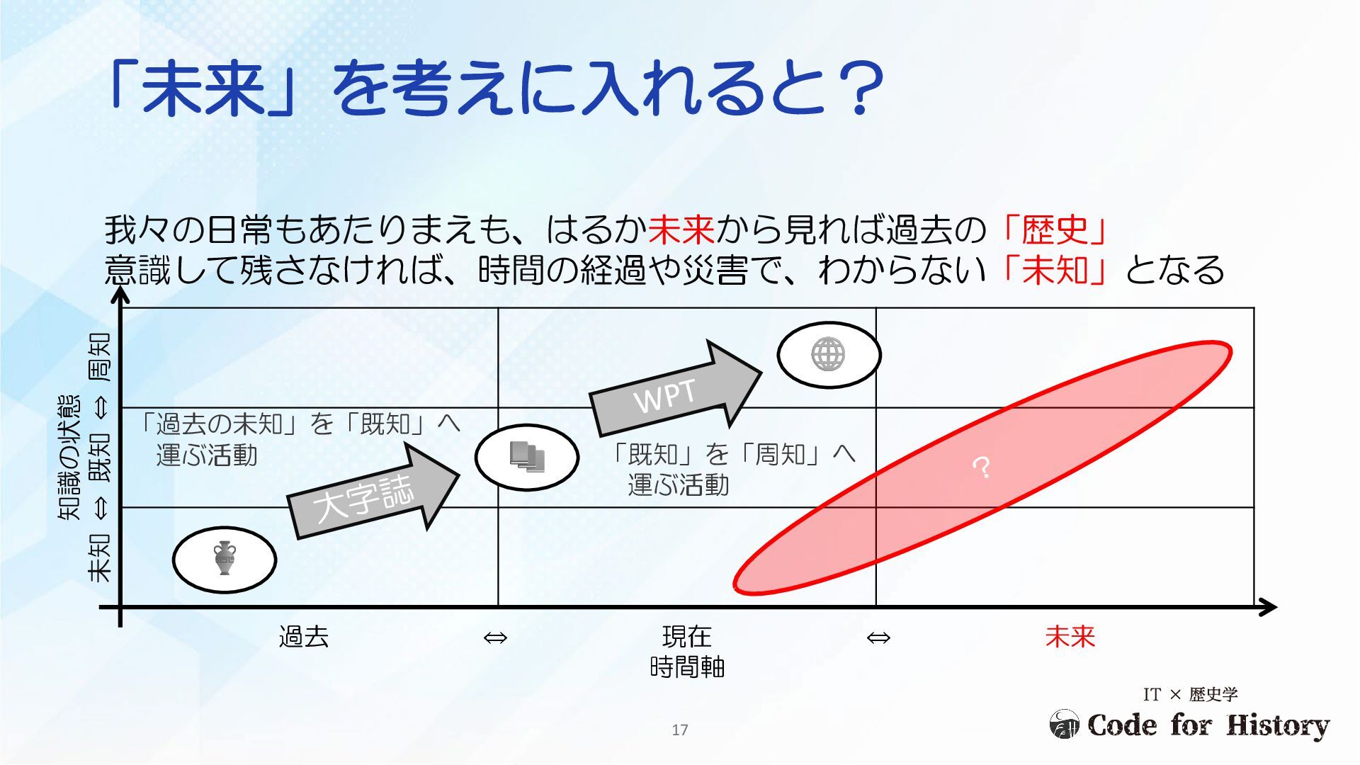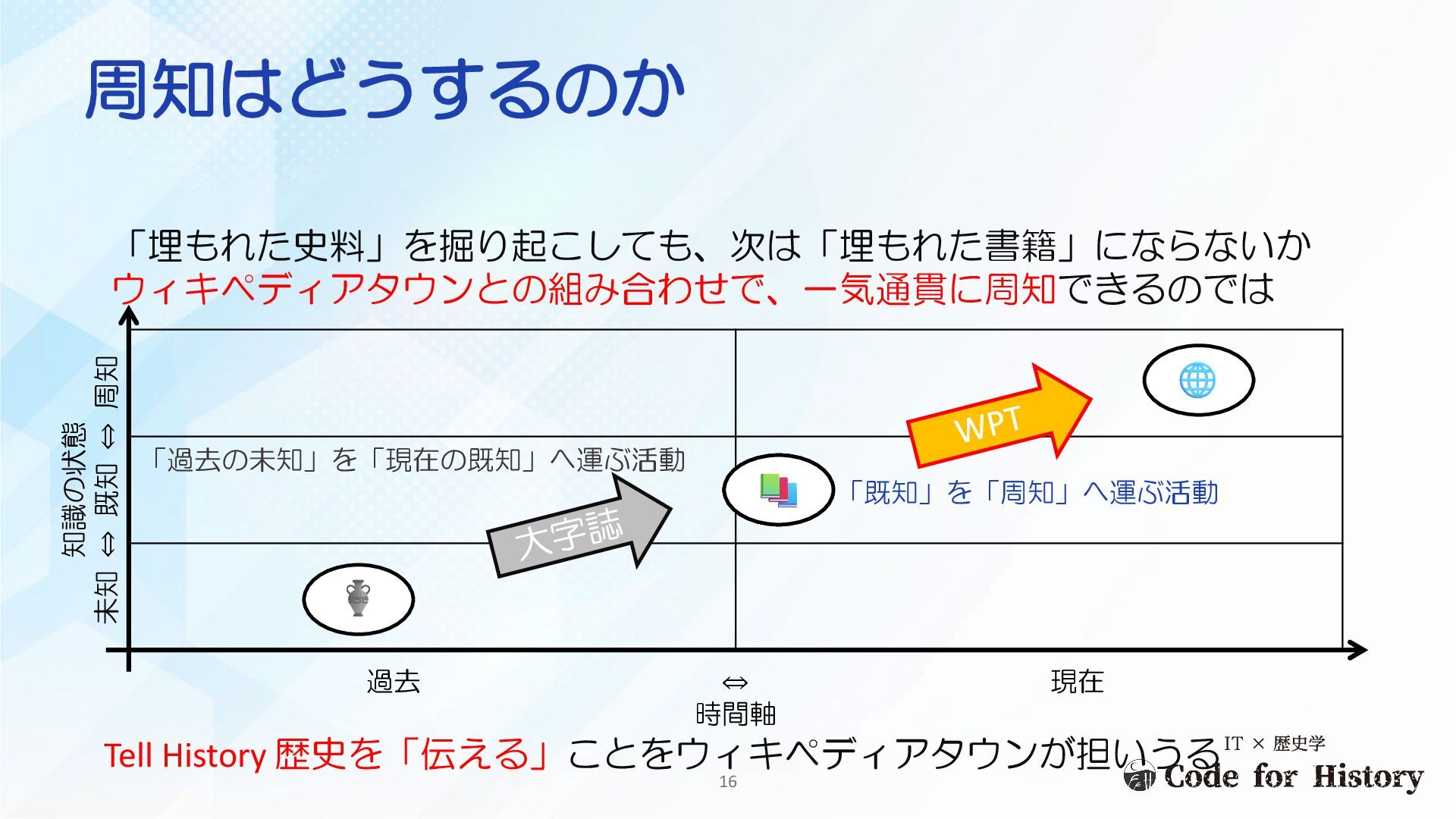 現在 時間軸 「過去の未知」を「現在の既知」へ運ぶ活動 ウィキペディアタウンとの組み合わせで、一気通貫に周知できるのでは 「既知」を「周知」へ運ぶ活動 Tell History 歴史を「伝える」ことをウィキペディアタウンが担いうる 16