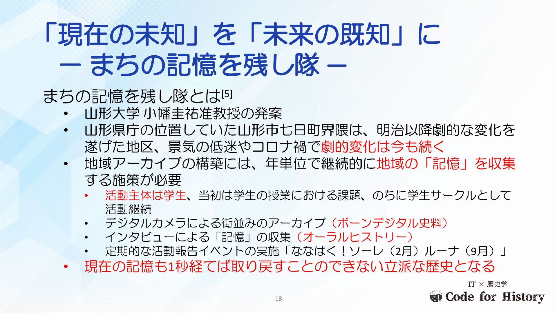 既知 ⇔ 周知 「過去の未知」を「既知」へ 運ぶ活動 「既知」を「周知」へ 運ぶ活動 我々の日常もあたりまえも、はるか未来から見れば過去の「歴史」 意識して残さなければ、時間の経過や災害で、わからない「未知」となる 17