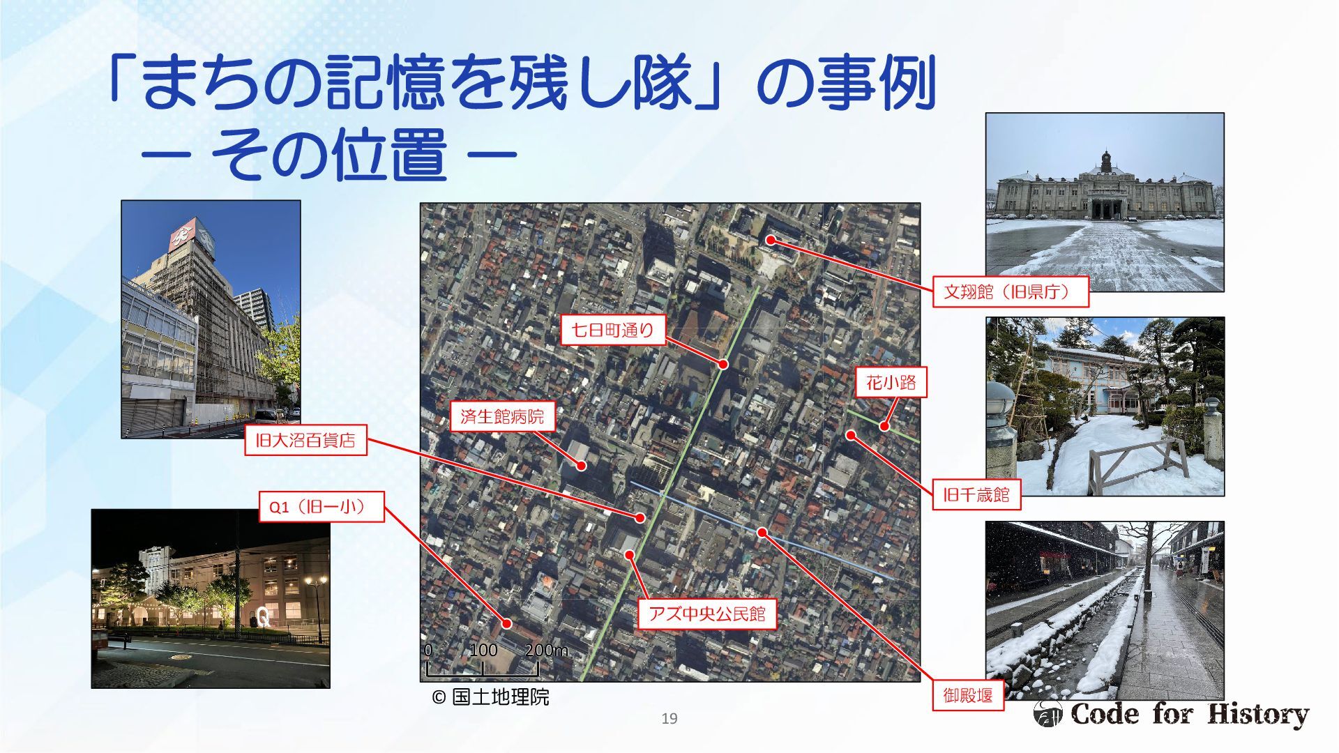 「まちの記憶を残し隊」の事例 - その位置 - 七日町通り 0 100 200m 0 100