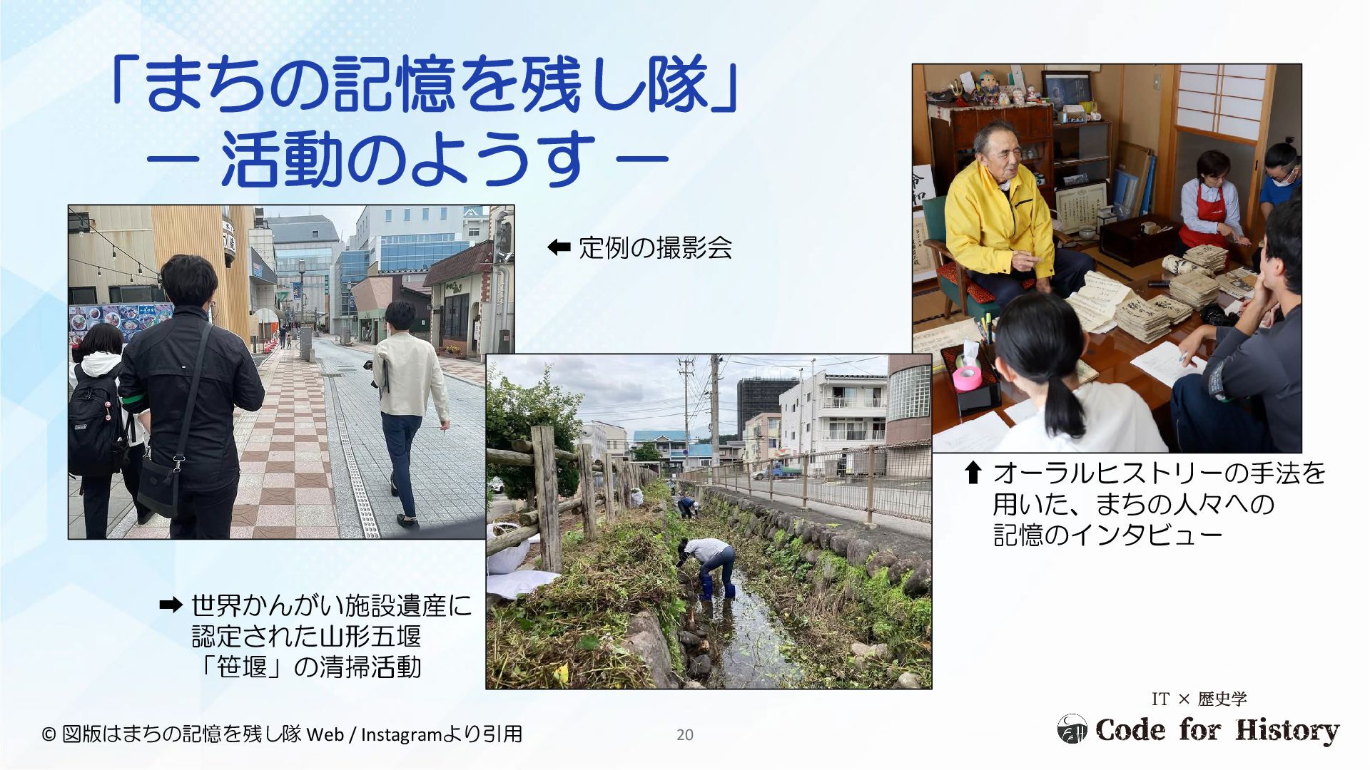 定例の撮影会 ⬆ オーラルヒストリーの手法を 用いた、まちの人々への 記憶のインタビュー ➡ 世界かんがい施設遺産に 認定された山形五堰 「笹堰」の清掃活動 「まちの記憶を残し隊」