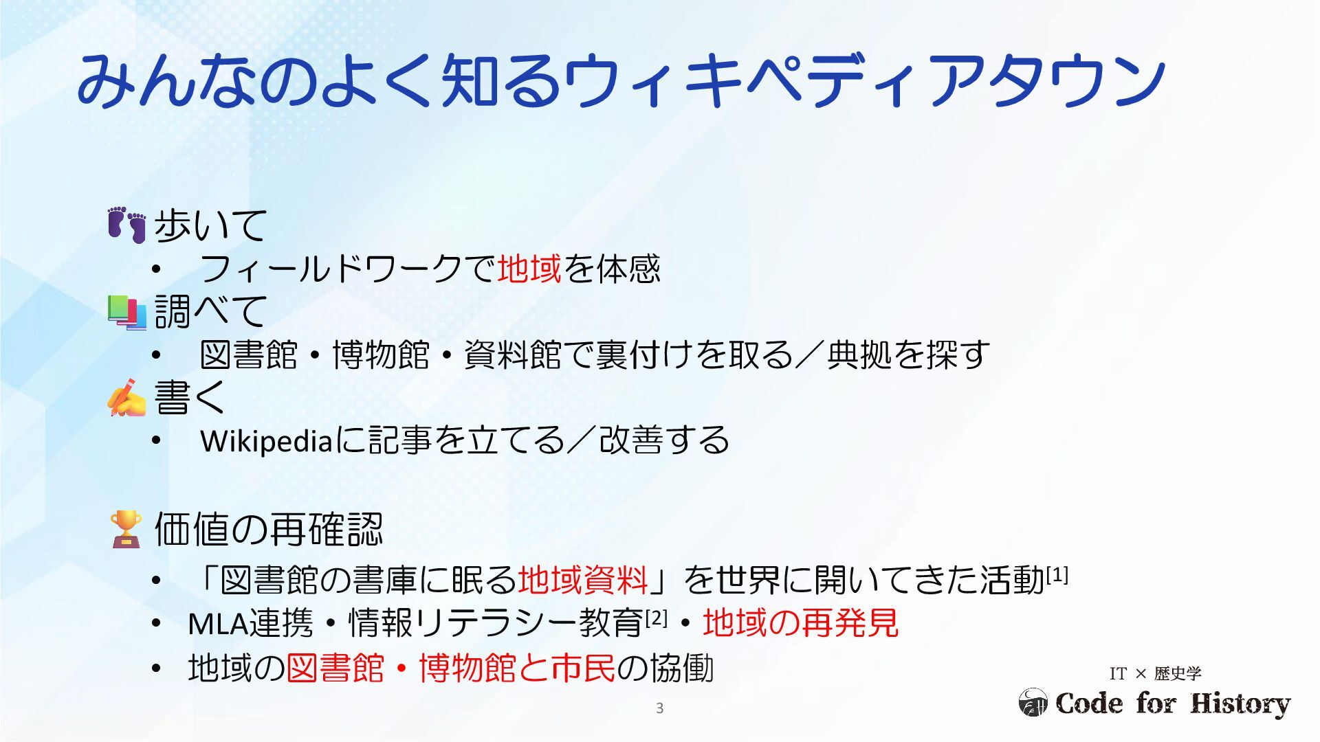 価値の再確認 • 「図書館の書庫に眠る地域資料」を世界に開いてきた活動[1] • MLA連携・情報リテラシー教育[2]・地域の再発見 • 地域の図書館・博物館と市民の協働 3