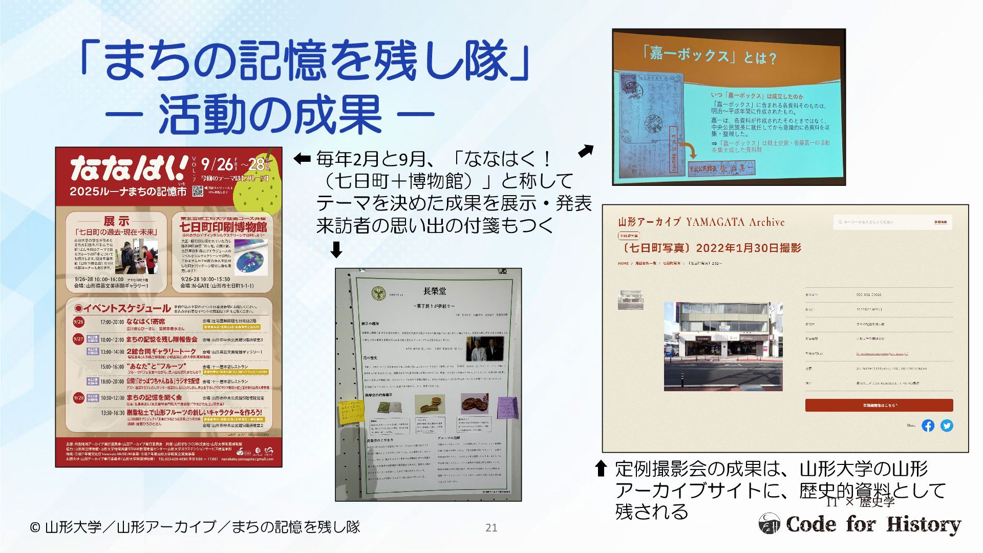 ➡ ⬆ 定例撮影会の成果は、山形大学の山形 アーカイブサイトに、歴史的資料として 残される 21