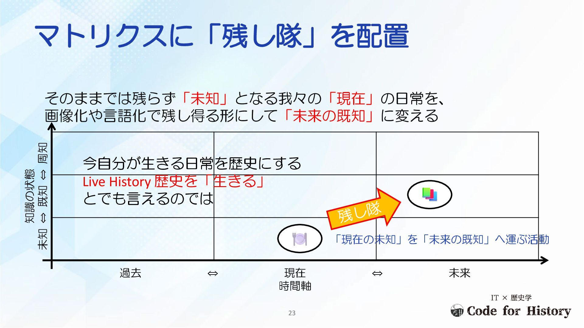 そのままでは残らず「未知」となる我々の「現在」の日常を、 画像化や言語化で残し得る形にして「未来の既知」に変える 過去 ⇔ 現在 ⇔ 未来 時間軸 マトリクスに「残し隊」を配置 知識の状態