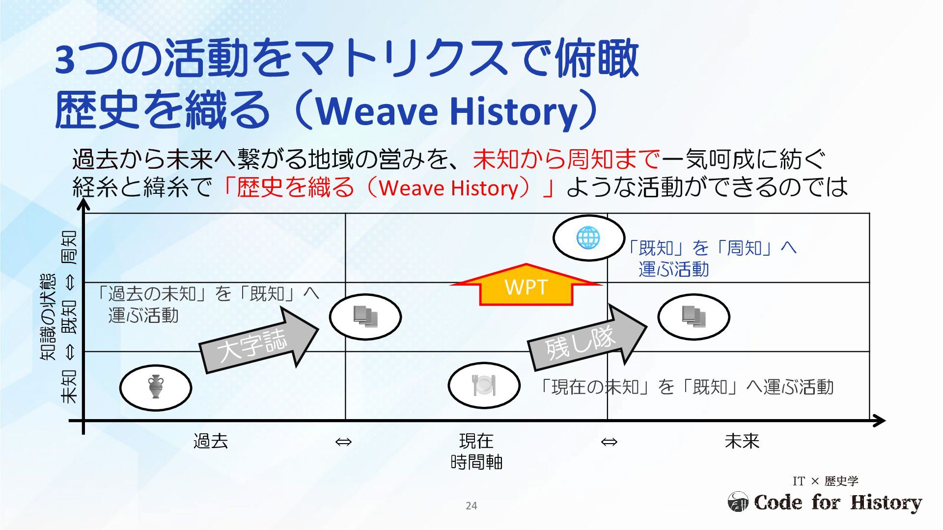 未知 ⇔ 既知 ⇔ 周知 「現在の未知」を「未来の既知」へ運ぶ活動 今自分が生きる日常を歴史にする Live History 歴史を「生きる」 とでも言えるのでは 23