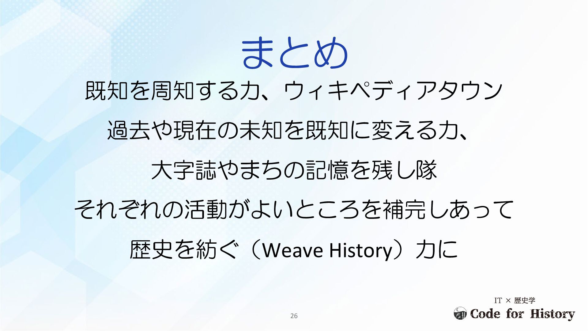 既知を周知する力、ウィキペディアタウン 過去や現在の未知を既知に変える力、 大字誌やまちの記憶を残し隊 それぞれの活動がよいところを補完しあって 歴史を紡ぐ(Weave History)力に まとめ 26