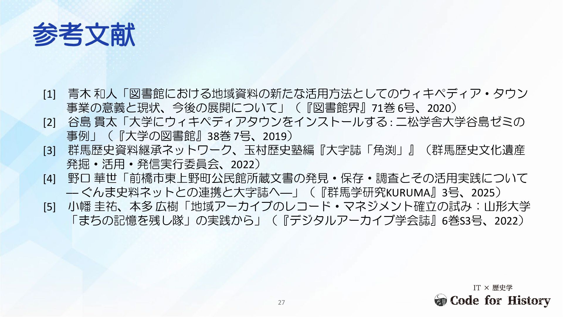 参考文献 [1] 青木 和人「図書館における地域資料の新たな活用方法としてのウィキペディア・タウン 事業の意義と現状、今後の展開について」(『図書館界』71巻 6号、2020) [2] 谷島 貫太「大学にウィキペディアタウンをインストールする :