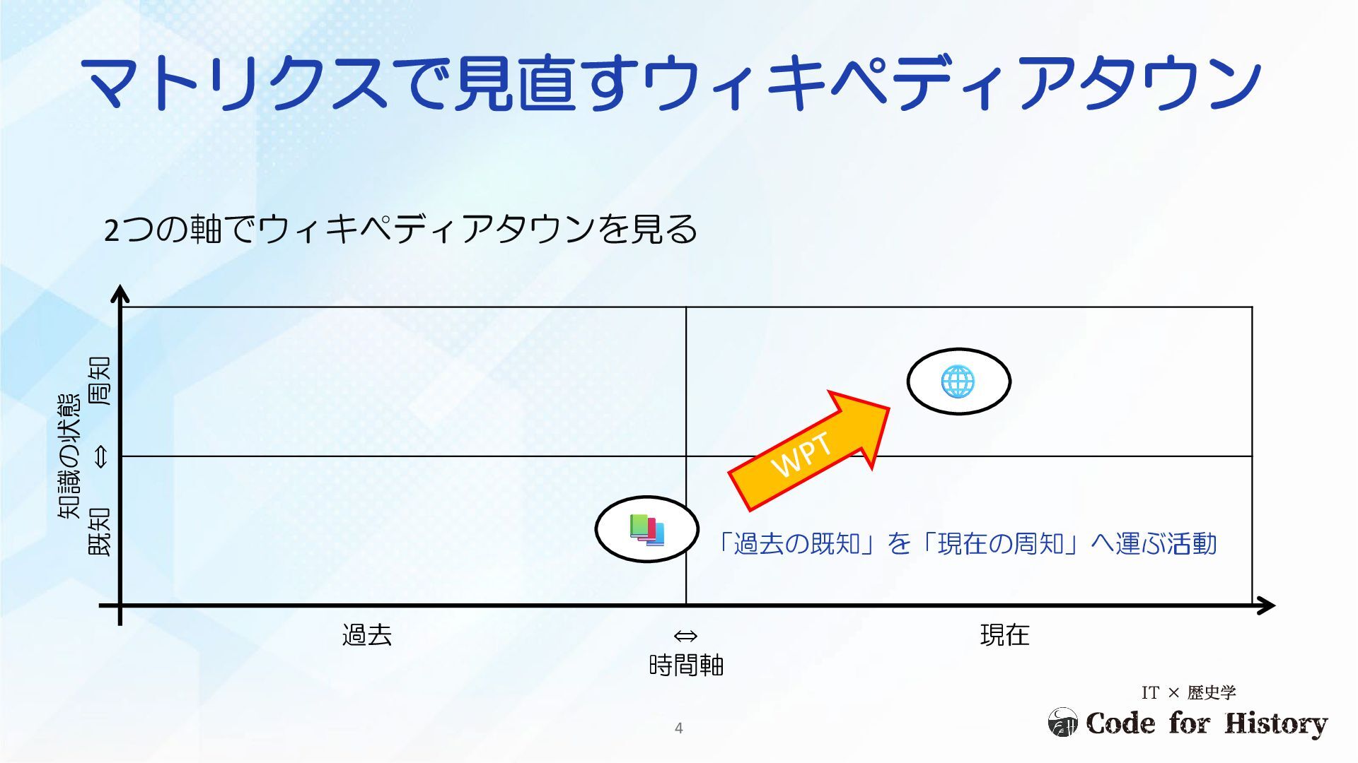 マトリクスで見直すウィキペディアタウン 2つの軸でウィキペディアタウンを見る 知識の状態 既知 ⇔ 周知 過去 ⇔ 現在 時間軸