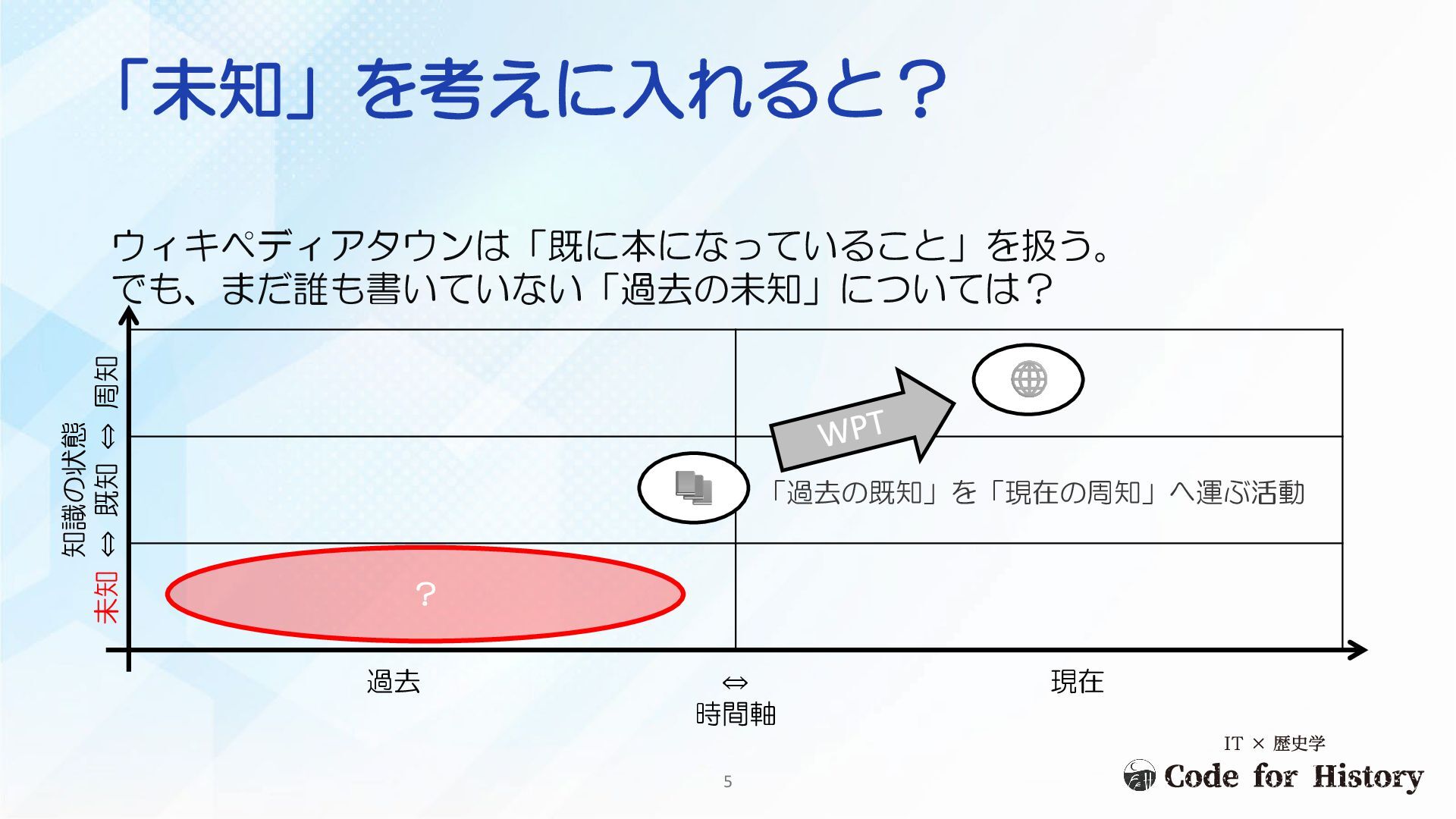 ⇔ 現在 時間軸 「過去の既知」を「現在の周知」へ運ぶ活動 ? 5