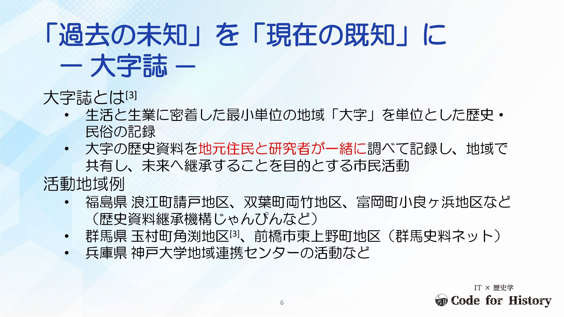 「過去の未知」を「現在の既知」に - 大字誌 - 大字誌とは[3] • 生活と生業に密着した最小単位の地域「大字」を単位とした歴史・ 民俗の記録 • 大字の歴史資料を地元住民と研究者が一緒に調べて記録し、地域で