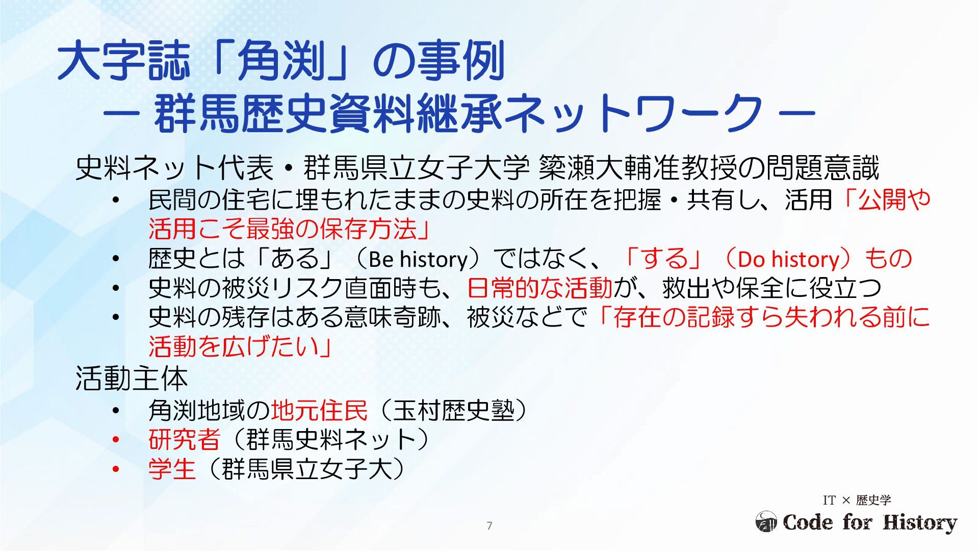 共有し、未来へ継承することを目的とする市民活動 活動地域例 • 福島県 浪江町請戸地区、双葉町両竹地区、富岡町小良ヶ浜地区など (歴史資料継承機構じゃんぴんなど) • 群馬県 玉村町角渕地区[3]、前橋市東上野町地区(群馬史料ネット) • 兵庫県 神戸大学地域連携センターの活動など 6