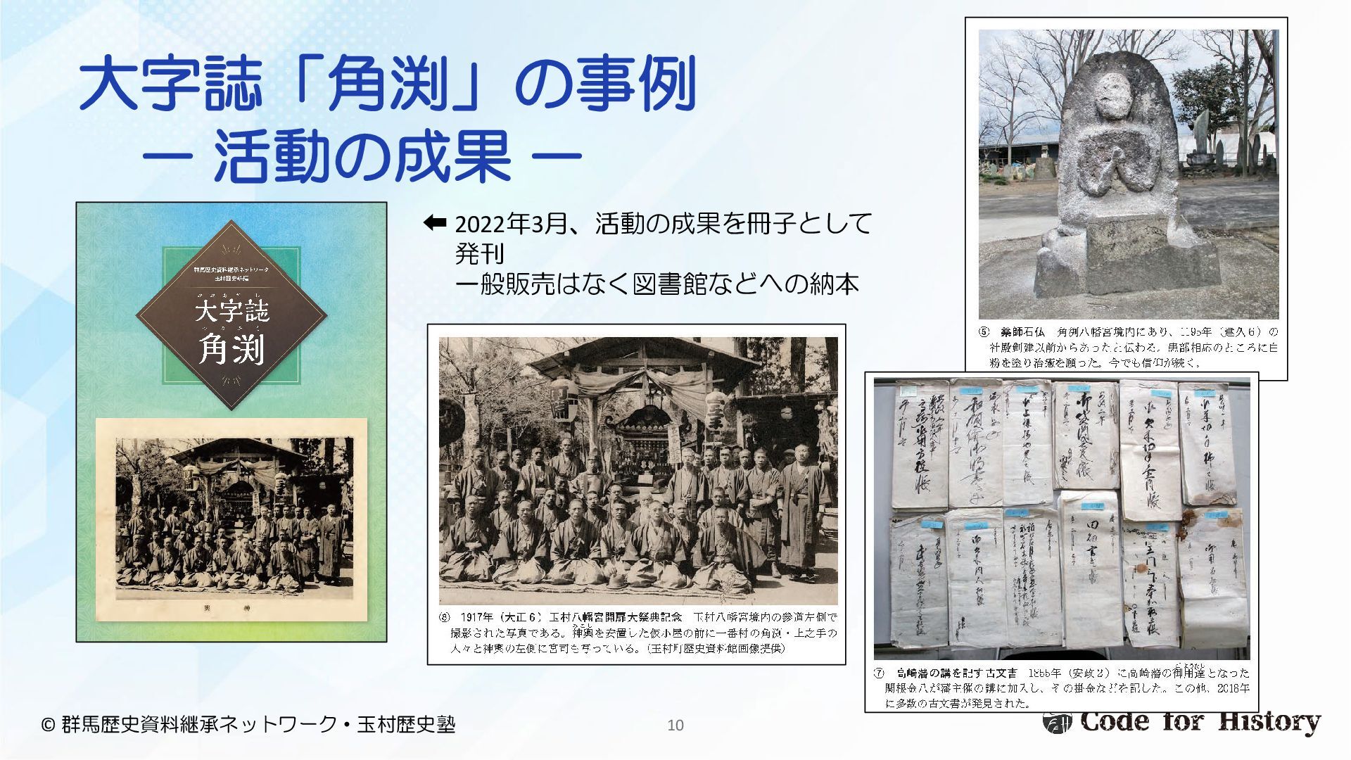 大字誌「角渕」の事例 - 活動の成果 - ⬅ 2022年3月、活動の成果を冊子として 発刊 一般販売はなく図書館などへの納本 © 群馬歴史資料継承ネットワーク・玉村歴史塾