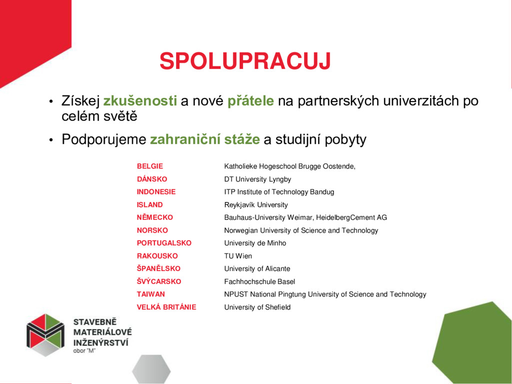 celém světě • Podporujeme zahraniční stáţe a studijní pobyty SPOLUPRACUJ BELGIE Katholieke Hogeschool Brugge Oostende, DÁNSKO DT University Lyngby INDONESIE ITP Institute of Technology Bandug ISLAND Reykjavík University NĚMECKO Bauhaus-University Weimar, HeidelbergCement AG NORSKO Norwegian University of Science and Technology PORTUGALSKO University de Minho RAKOUSKO TU Wien ŠPANĚLSKO University of Alicante ŠVÝCARSKO Fachhochschule Basel TAIWAN NPUST National Pingtung University of Science and Technology VELKÁ BRITÁNIE University of Shefield