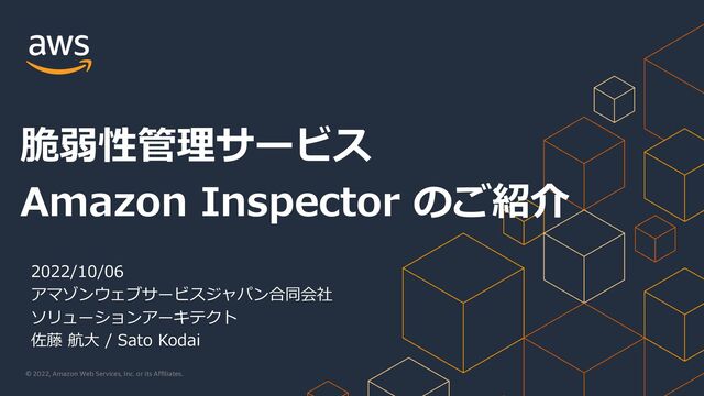 OS と プログラミング⾔語 • Amazon EC2 スキャン § Amazon Linux 2 § Cent OS § Debian Server § RedHat Enterprise Linux (RHEL) § Ubuntu § Windows Server (2022/9 Update! ) § etc.. • Amazon ECR スキャン § Cent OS § Debian Server § RedHat Enterprise Linux (RHEL) § Ubuntu Server, etc… • ECR スキャンの対応⾔語 § C#, Go, Java, JavaScript, § PHP, Python, Ruby, Rust 対応OSのバージョン等の詳細と最新の情報はこちらをご覧ください https://docs.aws.amazon.com/inspector/latest/user/supported.html