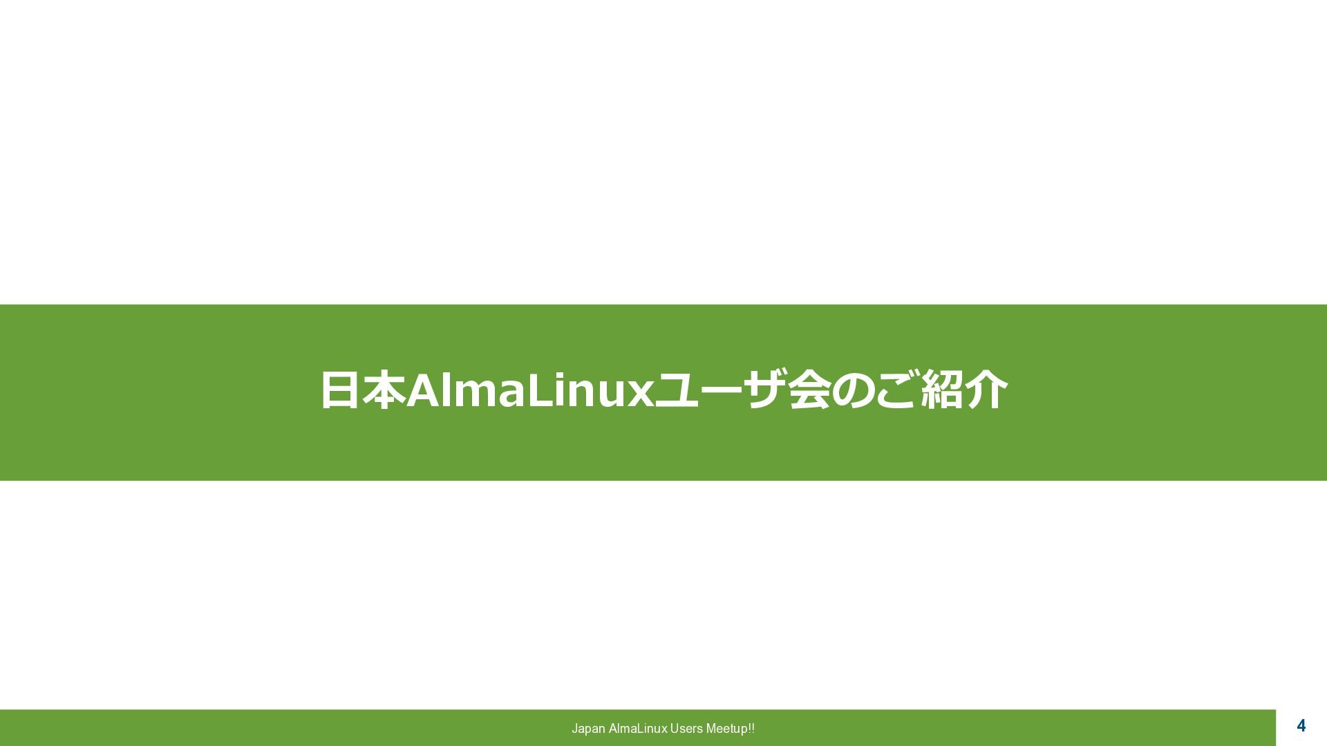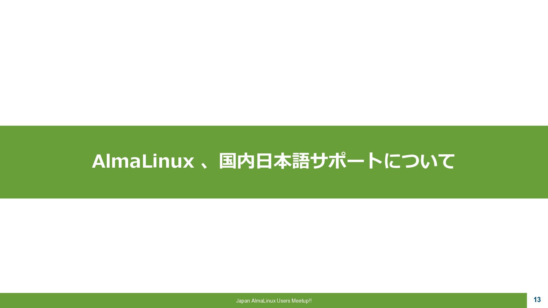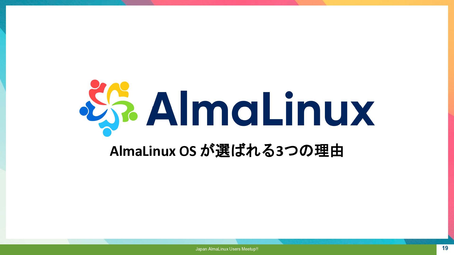 a critical role to play, 魂は生まれ変わる。私たちにはまだ 重要な役割がある。 ▪AlmaLinux OS • CentOSの精神的後継として開発 • RHEL ABI 互換 • 完全なコミュニテイ主導 • 永久に無償 “Alma”はラテン語で魂を意味し 一連のCentOS騒動で揺らいだ Linux コミュニテイ に向けた 敬意と新たな魂を表しています