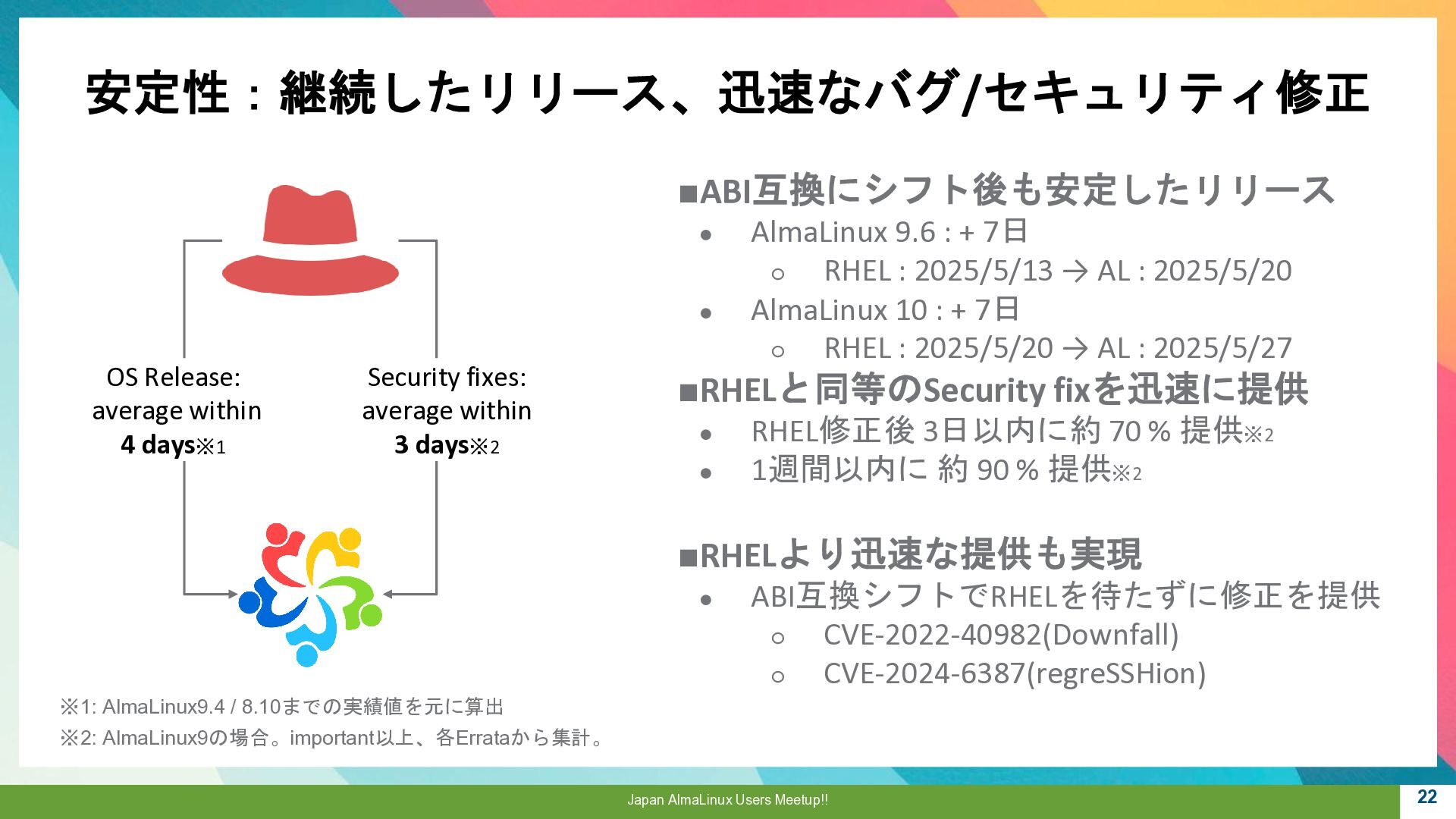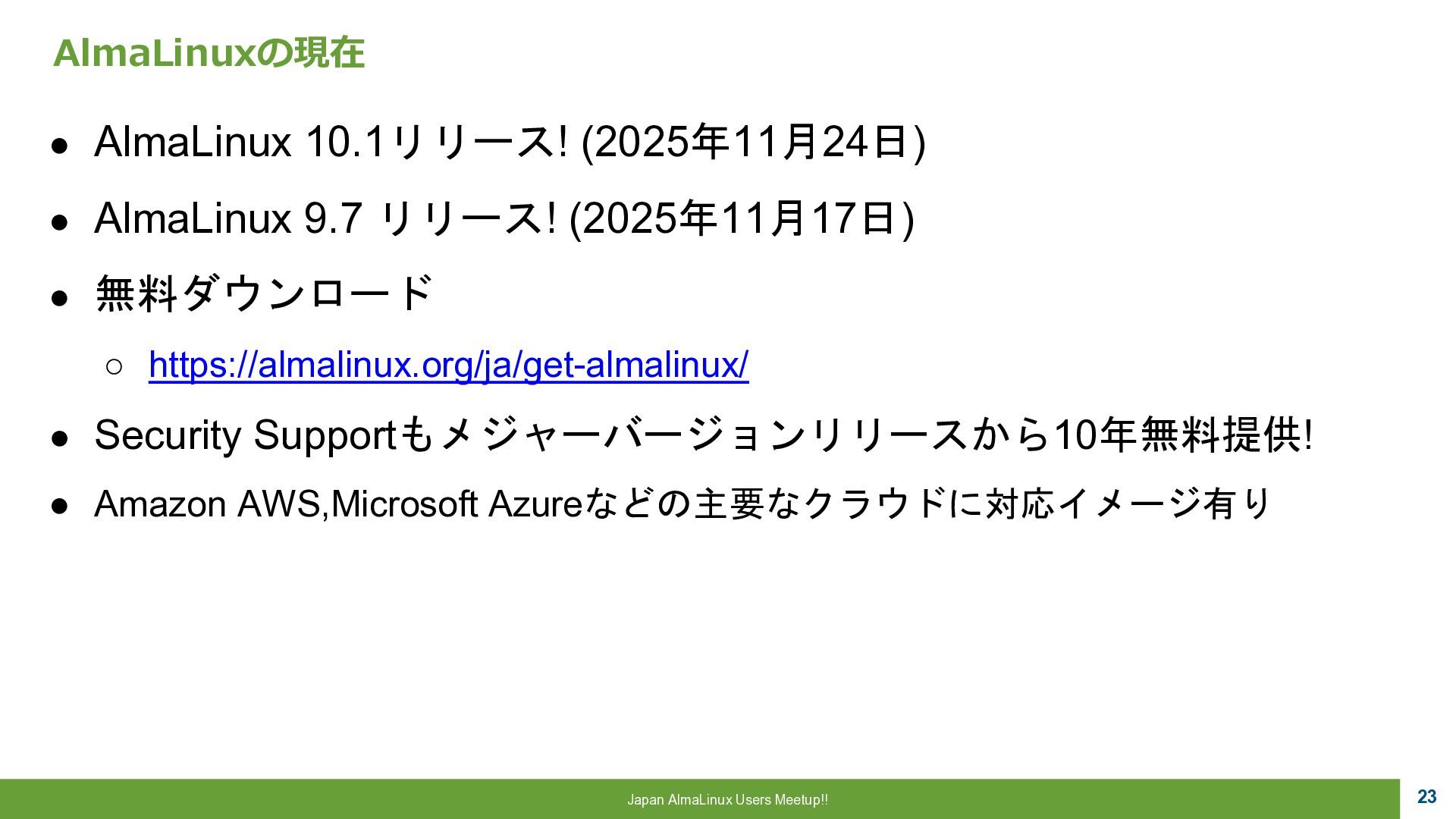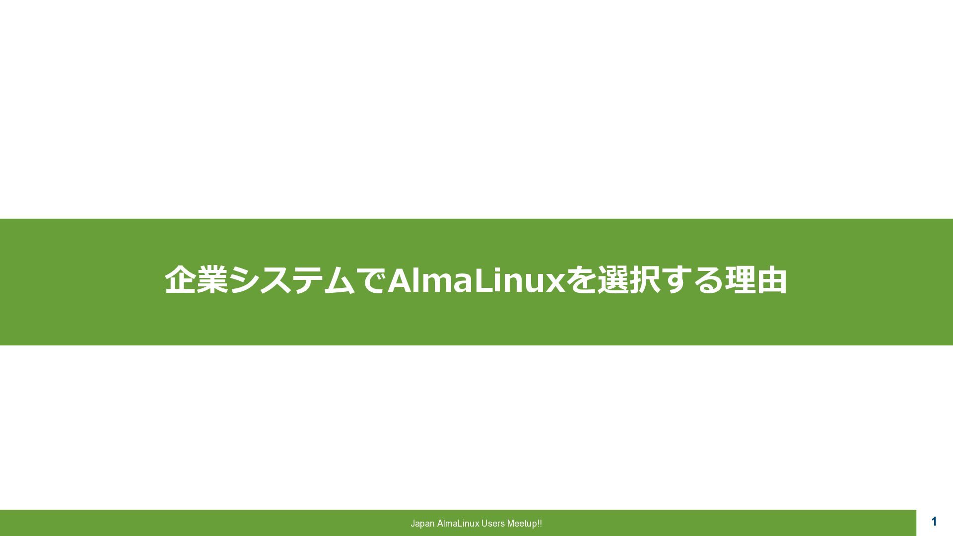 a critical role to play, 魂は生まれ変わる。私たちにはまだ 重要な役割がある。 ▪AlmaLinux OS • CentOSの精神的後継として開発 • RHEL ABI 互換 • 完全なコミュニテイ主導 • 永久に無償 “Alma”はラテン語で魂を意味し 一連のCentOS騒動で揺らいだ Linux コミュニテイ に向けた 敬意と新たな魂を表しています