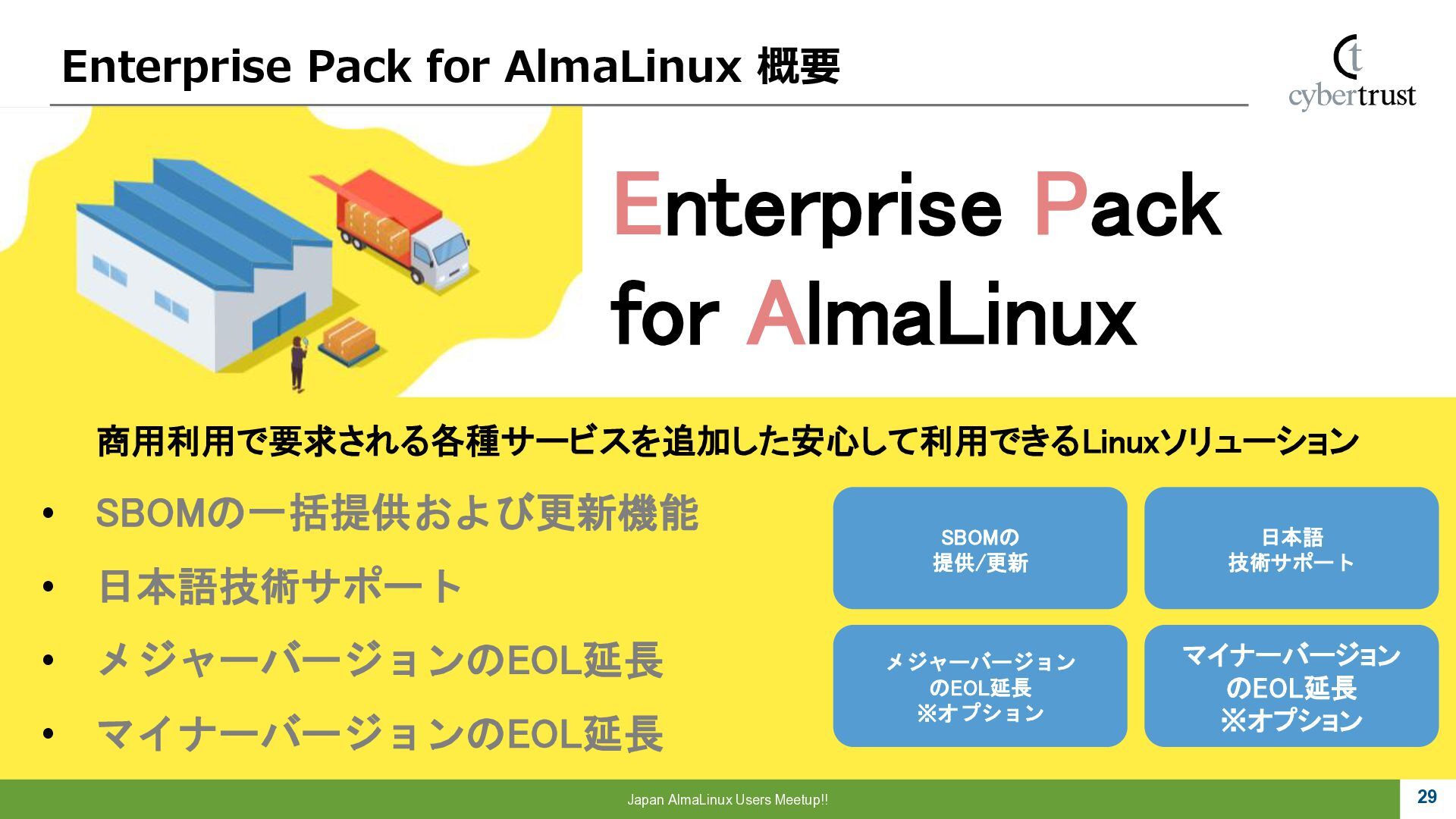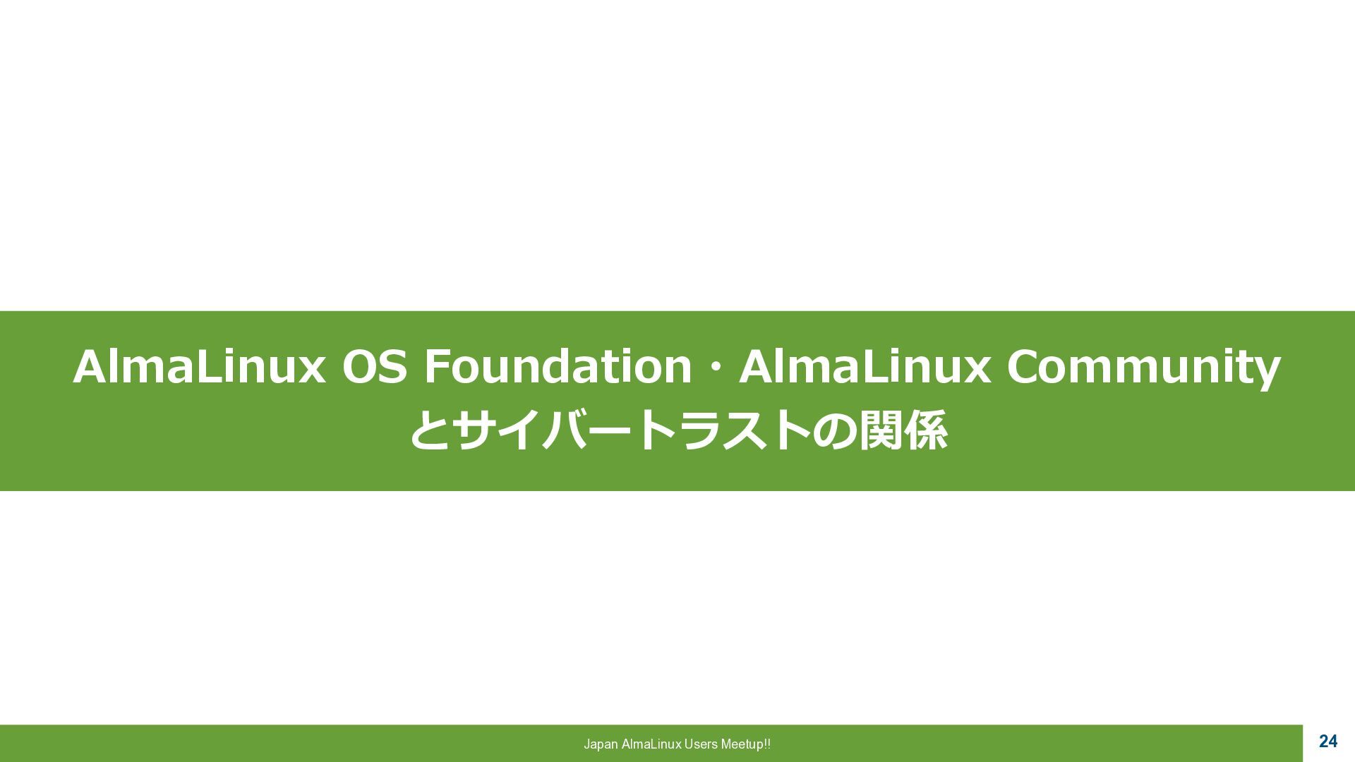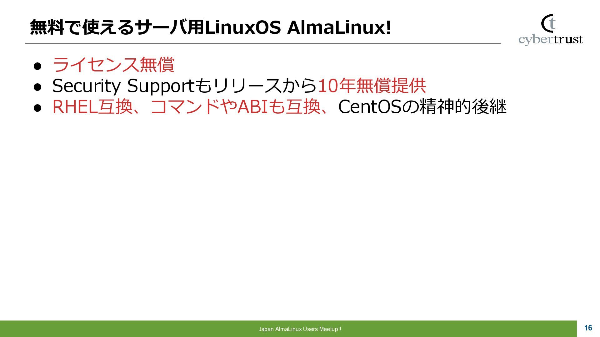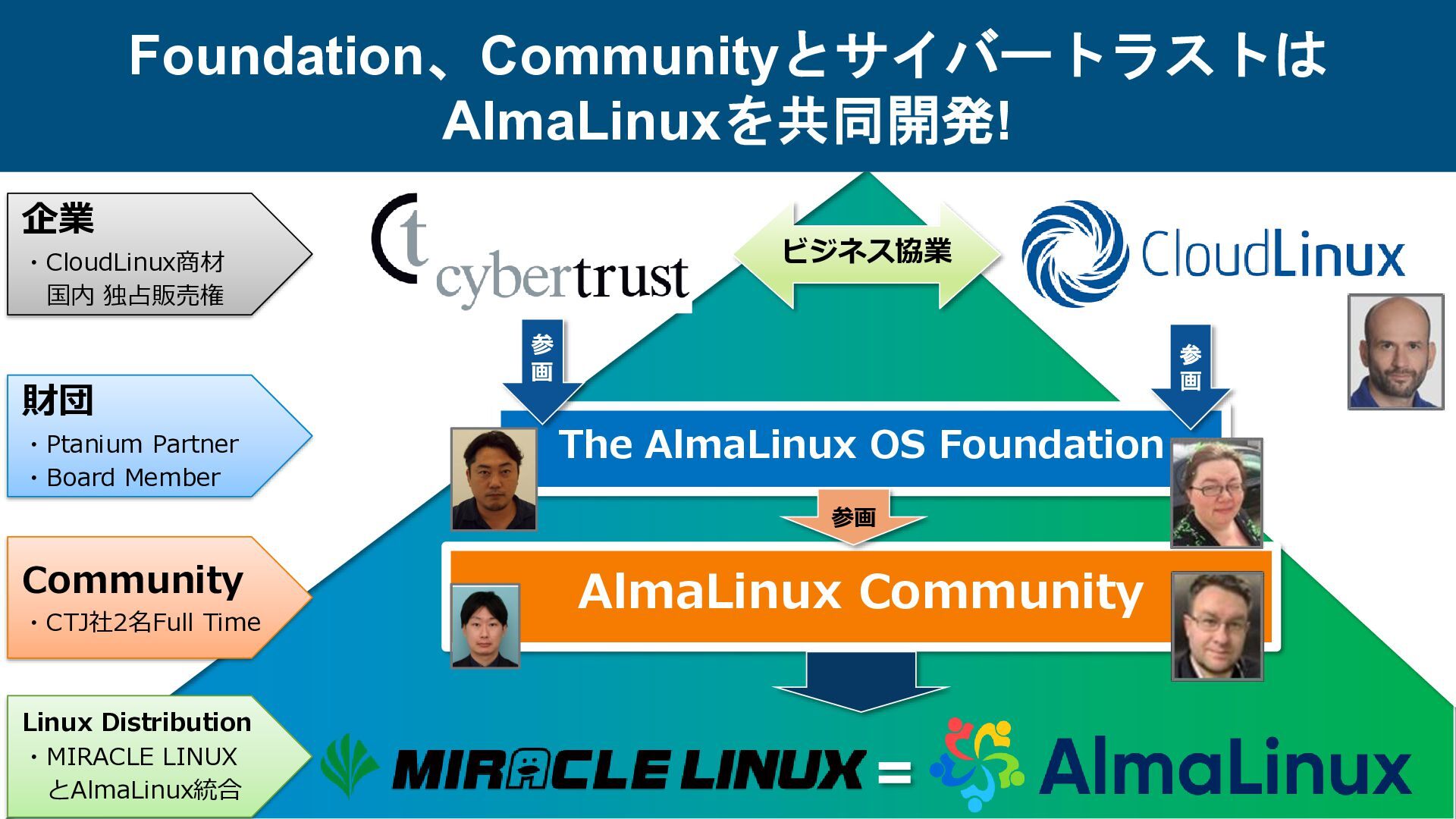 Community 参画 参 画 ビジネス協業 参 画 Foundation、Communityとサイバートラストは AlmaLinuxを共同開発! 企業 ・CloudLinux商材 国内 独占販売権 財団 ・Ptanium Partner ・Board Member Community ・CTJ社2名Full Time Linux Distribution ・MIRACLE LINUX とAlmaLinux統合