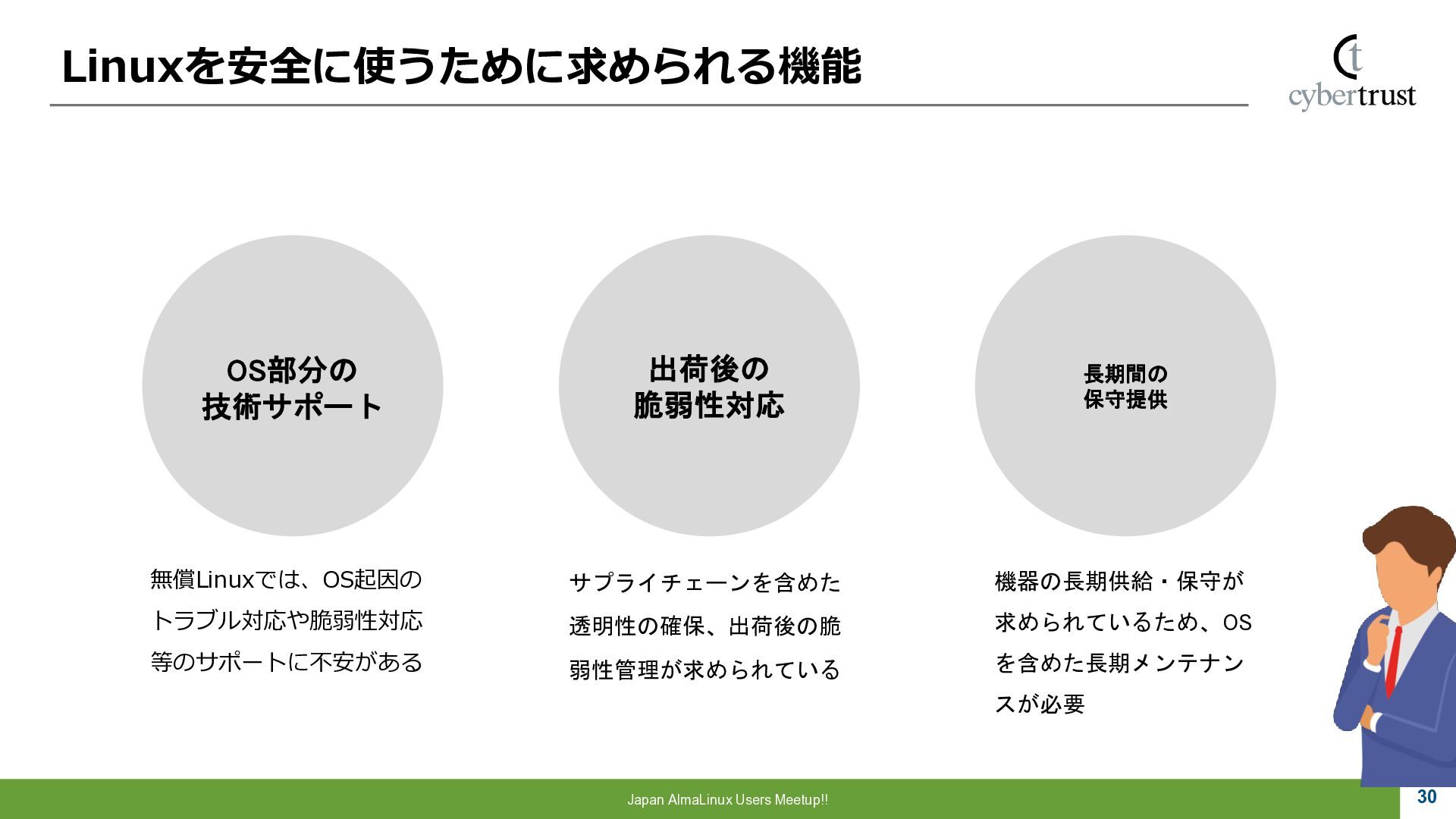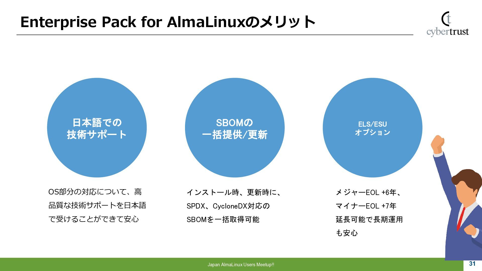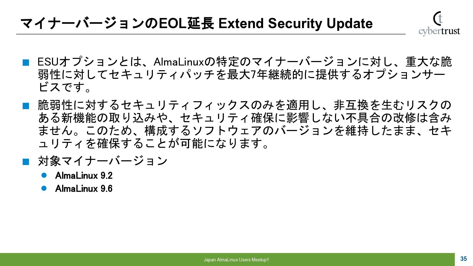 Community 参画 参 画 ビジネス協業 参 画 Foundation、Communityとサイバートラストは AlmaLinuxを共同開発! 企業 ・CloudLinux商材 国内 独占販売権 財団 ・Ptanium Partner ・Board Member Community ・CTJ社2名Full Time Linux Distribution ・MIRACLE LINUX とAlmaLinux統合