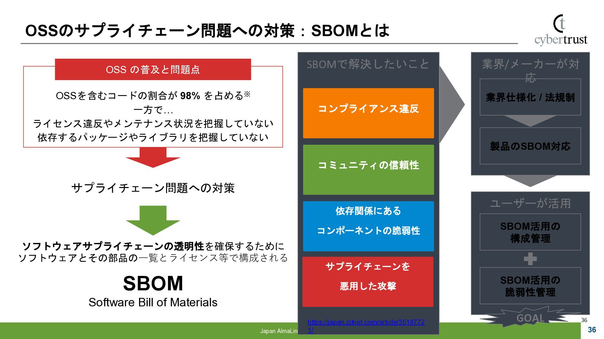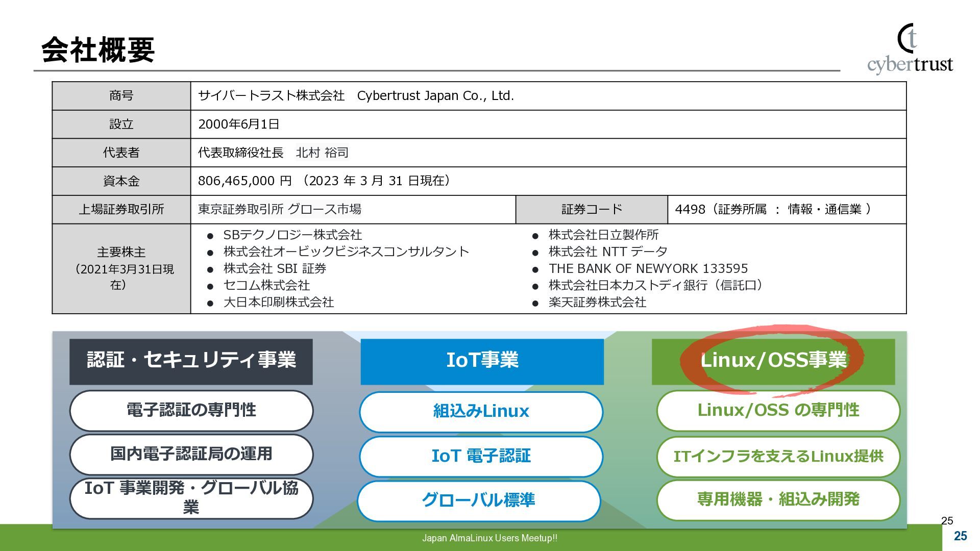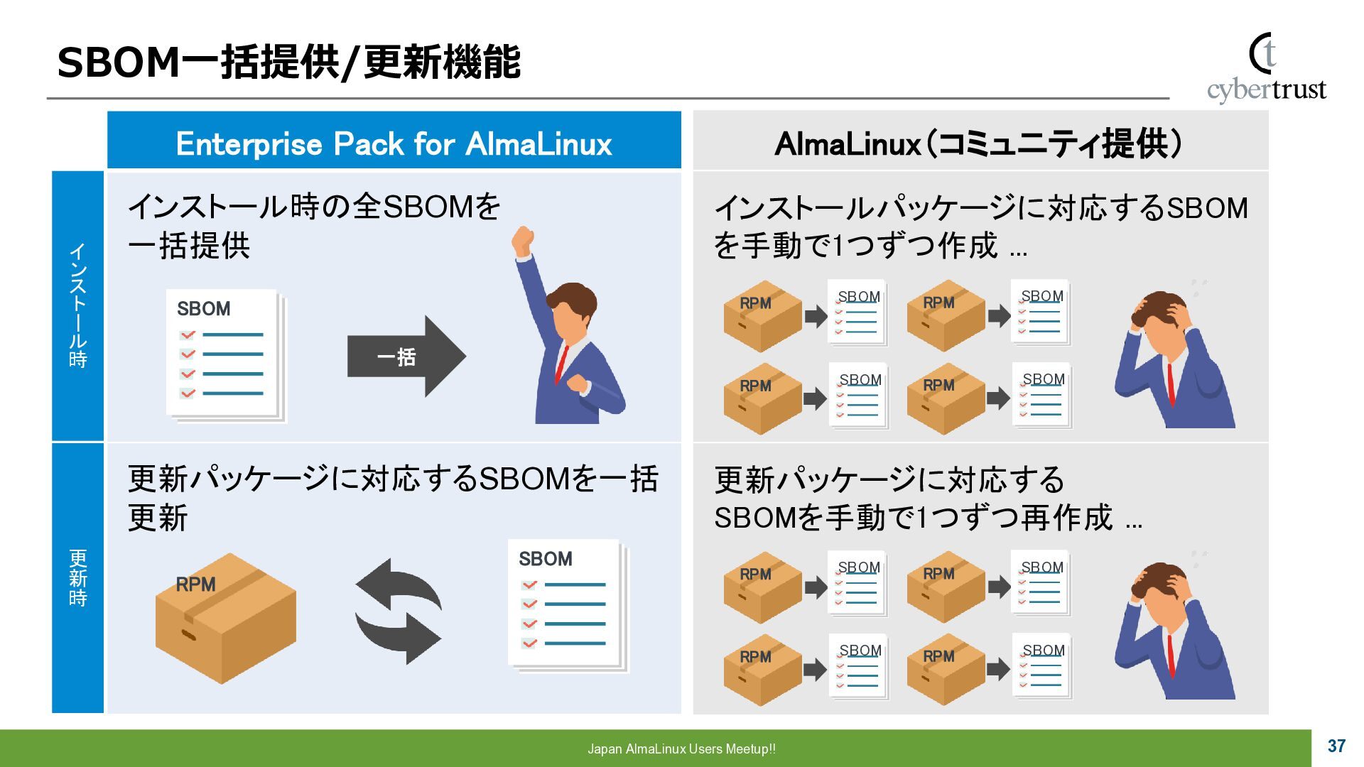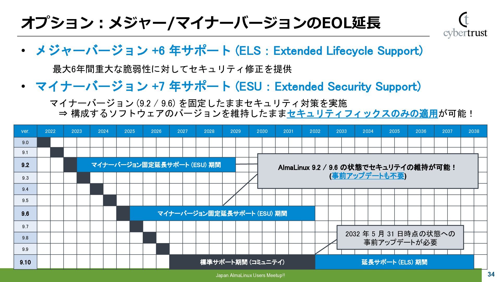 Community 参画 参 画 ビジネス協業 参 画 Foundation、Communityとサイバートラストは AlmaLinuxを共同開発! 企業 ・CloudLinux商材 国内 独占販売権 財団 ・Ptanium Partner ・Board Member Community ・CTJ社2名Full Time Linux Distribution ・MIRACLE LINUX とAlmaLinux統合